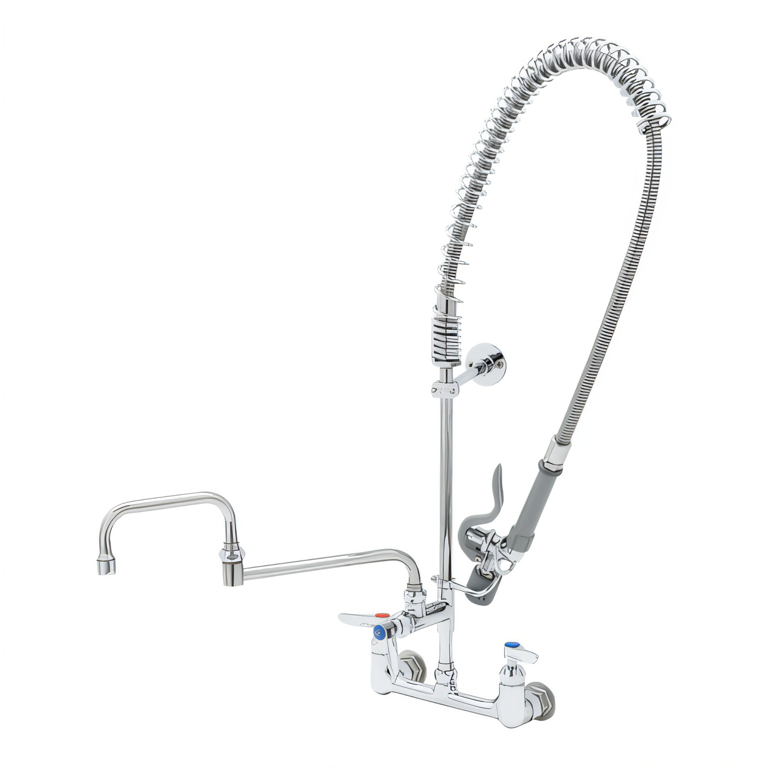 Pre-Rinse Unit, 8" wall mount, 15" double joint swing nozzle, 6" wall support, 44" stainless steel flex hose, ceramic cartridge, add-on faucet, 2.2 GPM aerator, .65 GPM spray valve, 1/2" NPT, EPAct2005 compliant