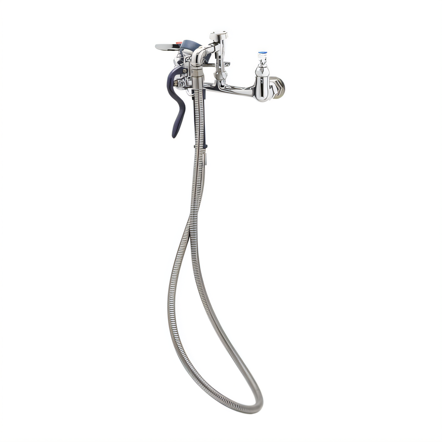 Spray Assembly, wall mount mixing faucet with 8" adjustable centers, quarter-turn Eterna cartridges with spring checks, lever handles with color coded indexes, 3/8" NPT vacuum breaker, high flow blue angled spray valve (EB-0107-035), 68" flexible stainless steel hose with heat-resistant blue handle & hold down ring, finger hook, polished chrome-plated brass faucet body, 1/2" NPT female inlets, CSA