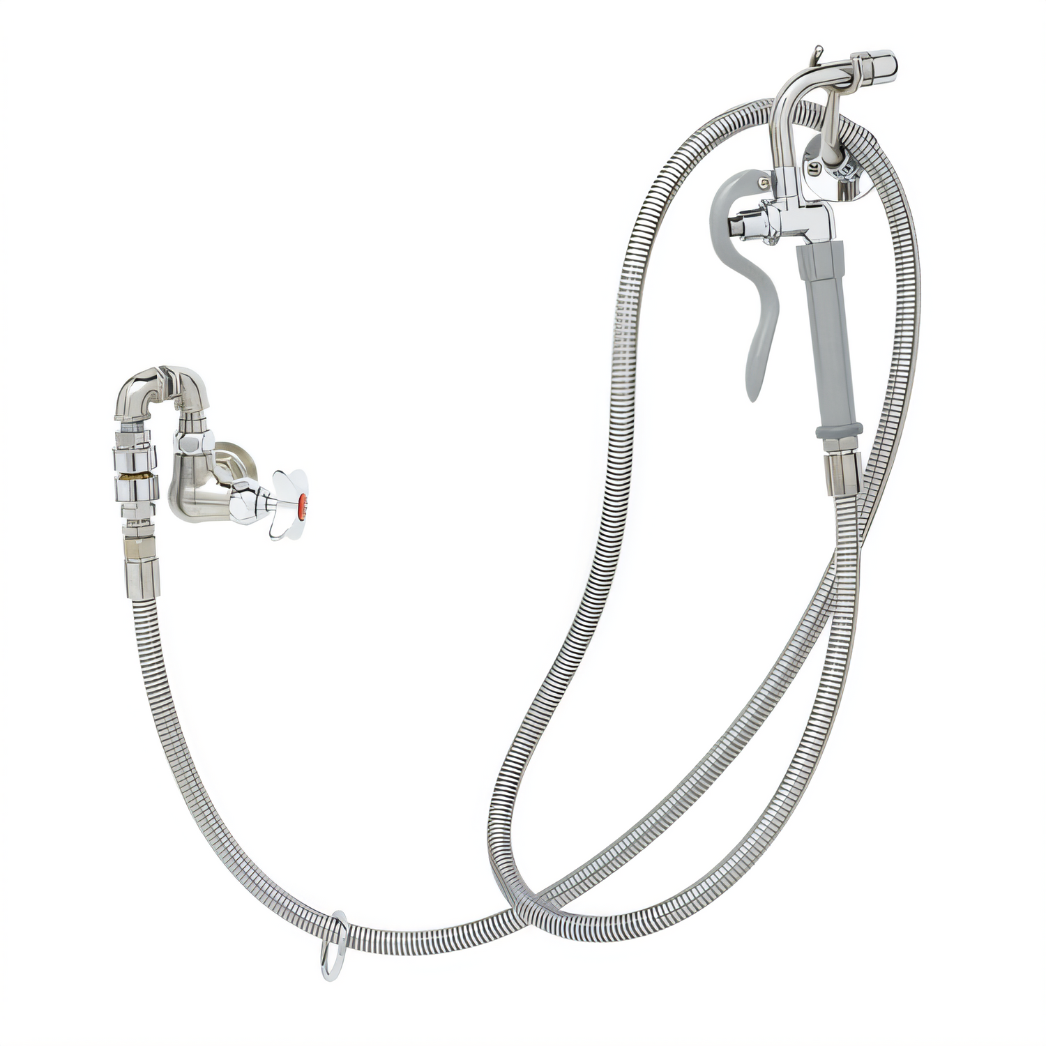 Pre-Rinse Unit, wall mount, single faucet, Eterna cartridge, 96" stainless steel flex hose, 90° spray nozzle, 4 arm wrist handle, vacuum breaker, wall hook, 2.2 GPM aerator, low lead, 1/2" NPT