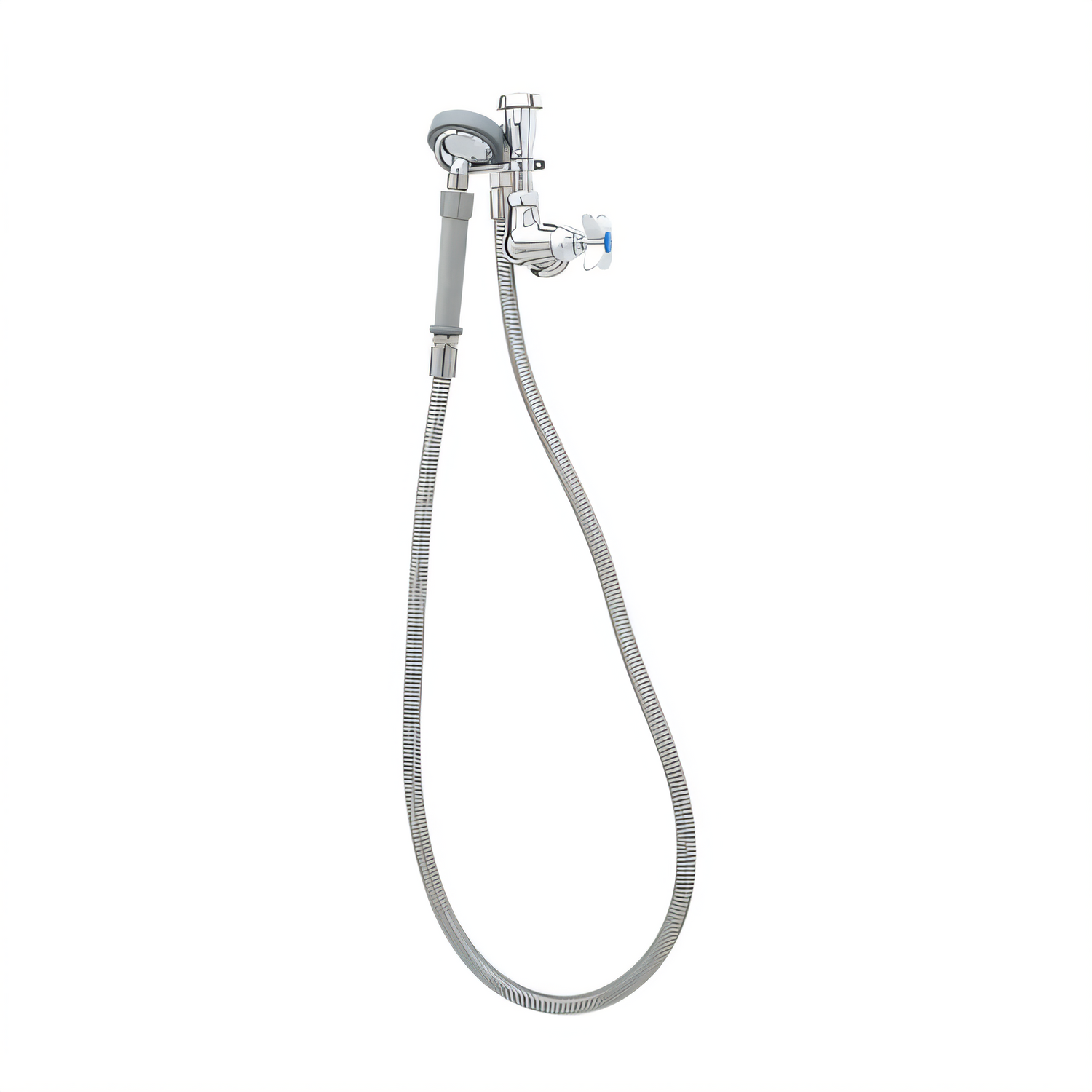 Spray Unit, with single control valve, wall mounted faucet, vacuum breaker, 5 ft. flexible stainless steel hose, spray head without self-closing valve, finger hook, 1/2" IPS female inlet, specify C or H index button