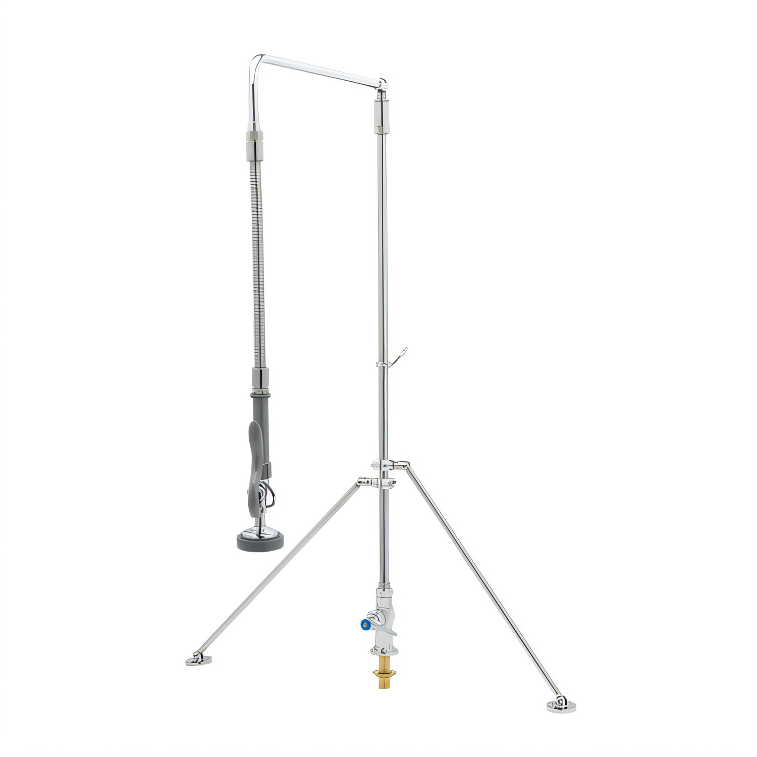 Pre-Rinse Unit, deck mount, single hole mixing faucet, quarter-turn Eterna cartridge with spring check, lever handle, 32" EasyInstall riser with bi-pod supports, 18" overhead swivel arm, 20" flexible stainless steel hose with heat-resistant gray handle and hold down ring, 1.15 gpm spray valve (B-0107), temperature control mixing valve with integral check valves, 18" flexible stainless steel supply hoses, finger hook, includes optional 1/4" NPT male tailpiece & nut, polished chrome plated brass faucet body, 1/2" NPSM male inlets, cCSAus