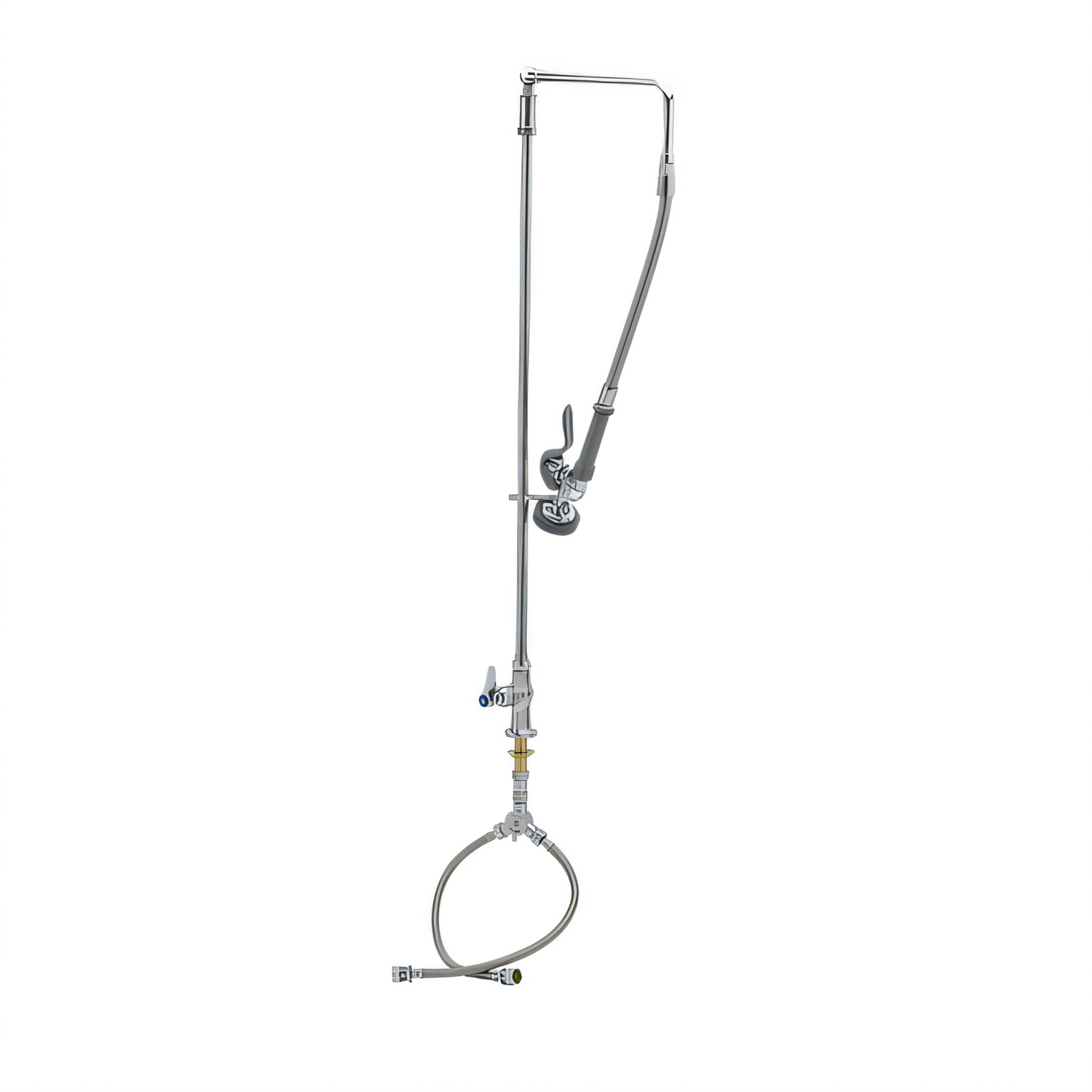 Pre-Rinse Unit, deck mount, single hole mixing faucet, quarter-turn Eterna cartridge with spring check, lever handle, 32" EasyInstall riser, 12" overhead swivel arm, 20" flexible stainless steel hose with heat-resistant gray handle and hold down ring, 1.15 gpm spray valve (B-0107), temperature control mixing valve with integral check valves, 18" flexible stainless steel supply hoses, finger hook, polished chrome plated brass faucet body, 1/2" NPSM male inlets, cCSAus