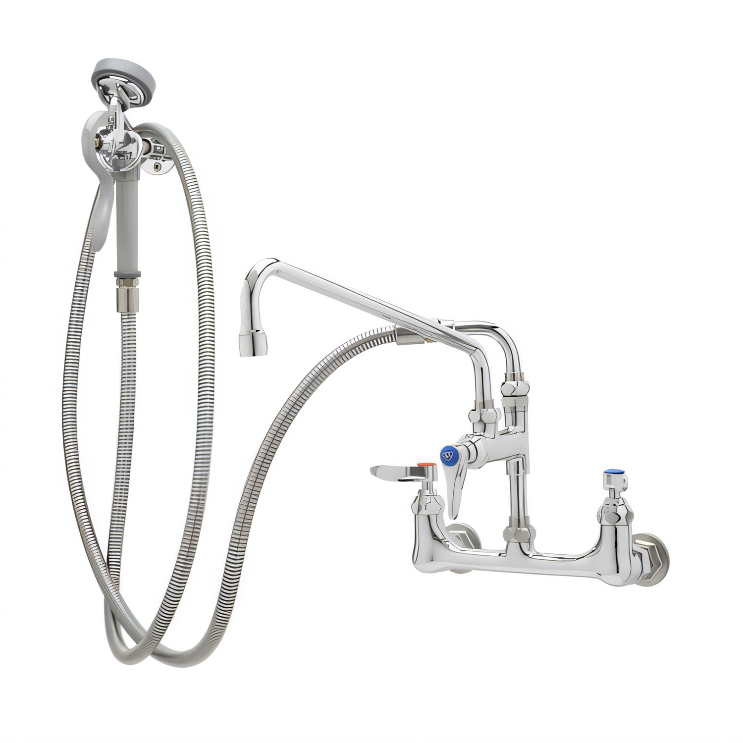 Spray Assembly, wall mount mixing faucet with 8" adjustable centers, EasyInstall add-on faucet, 8" swing nozzle with stream regulator outlet (060X), quarter-turn Eterna cartridges with spring checks, lever handles with color coded indexes, 3/8" NPT vacuum breaker (B-0970-FE), 90° swivel adapter arm, 96" flexible stainless steel hose with heat-resistant gray handle & hold down ring, 1.15 GPM angled spray valve (B-0107-035), wall hook, polished chrome-plated brass faucet body, 1/2" NPT female inlets, CSA
