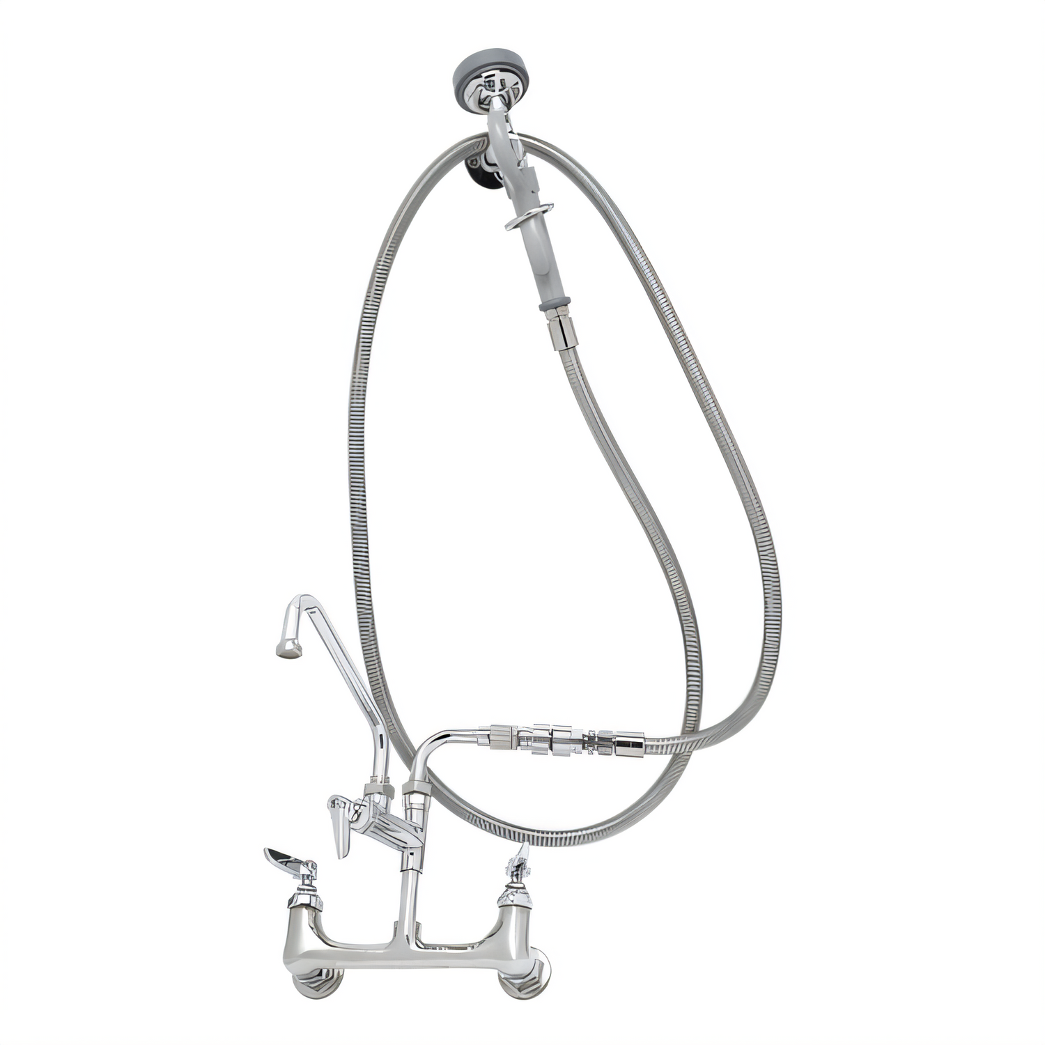 Spray Assembly, wall mount mixing faucet with 8" adjustable centers, EasyInstall add-on faucet, 12" swing nozzle with stream regulator outlet (062X), quarter-turn Eterna cartridges with spring checks, lever handles with color coded indexes, 3/8" NPT vacuum breaker (B-0970-FE), 90° swivel adapter arm, 104" flexible stainless steel hose with heat-resistant gray handle & hold down ring, 1.15 GPM angled spray valve (B-0107-035), wall hook, polished chrome-plated brass faucet body, 1/2" NPT female inlets, CSA
