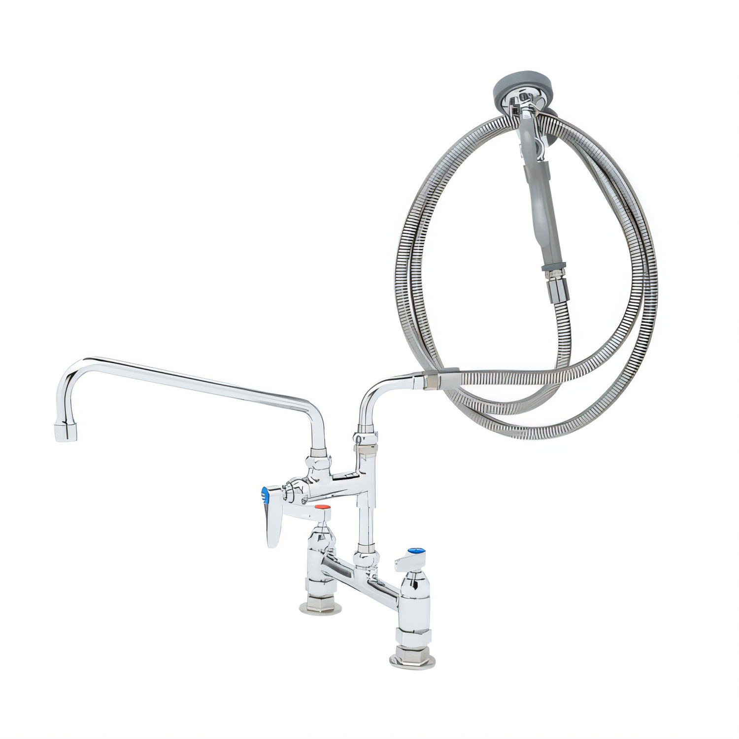 Pre-Rinse Unit, 8" deck mount base, add-on faucet with 12" swing nozzle, hose & angled spray valve, wall hook, quarter-turn Eterna cartridges, low lead