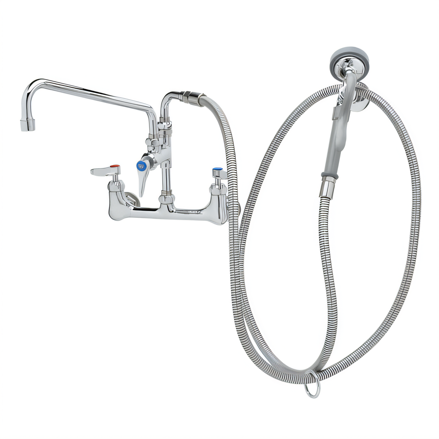 Spray Assembly, wall mount mixing faucet with 8" adjustable centers, EasyInstall add-on faucet, 12" swing nozzle with stream regulator outlet (062X), quarter-turn Cerama cartridges with check valves, lever handles with color coded indexes, 90° swivel adapter arm, 104" flexible stainless steel hose with heat-resistant gray handle & hold down ring, 1.15 GPM angled spray head (B-0107-035), wall hook, polished chrome-plated brass faucet body, 1/2" NPT female inlets, CSA