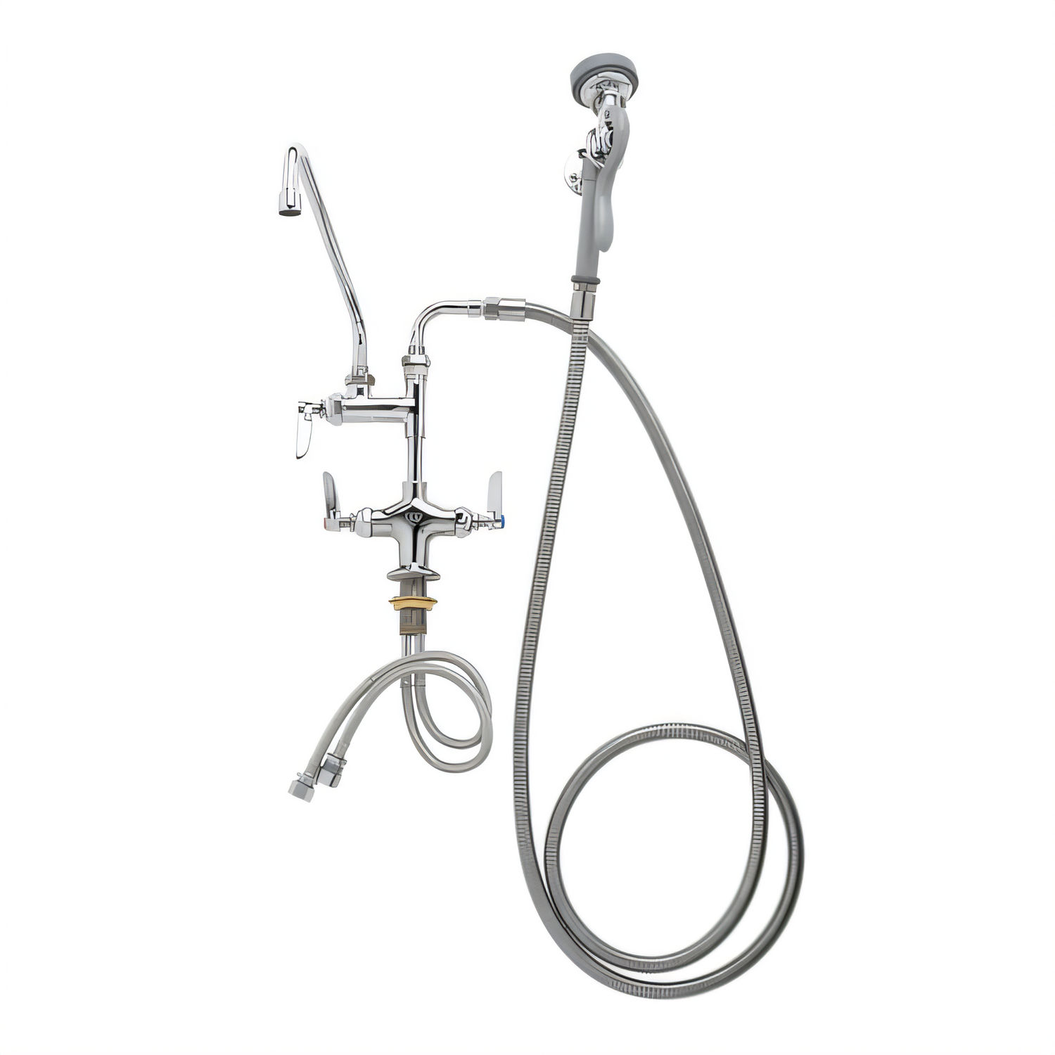 Pre-Rinse Unit, single hole base, deck mount, add-on-faucet, 18" double joint swing nozzle, 104" stainless steel hose, swivel adapter arm, vacuum breaker, wall hook, quarter-turn Eterna cartridges, low lead