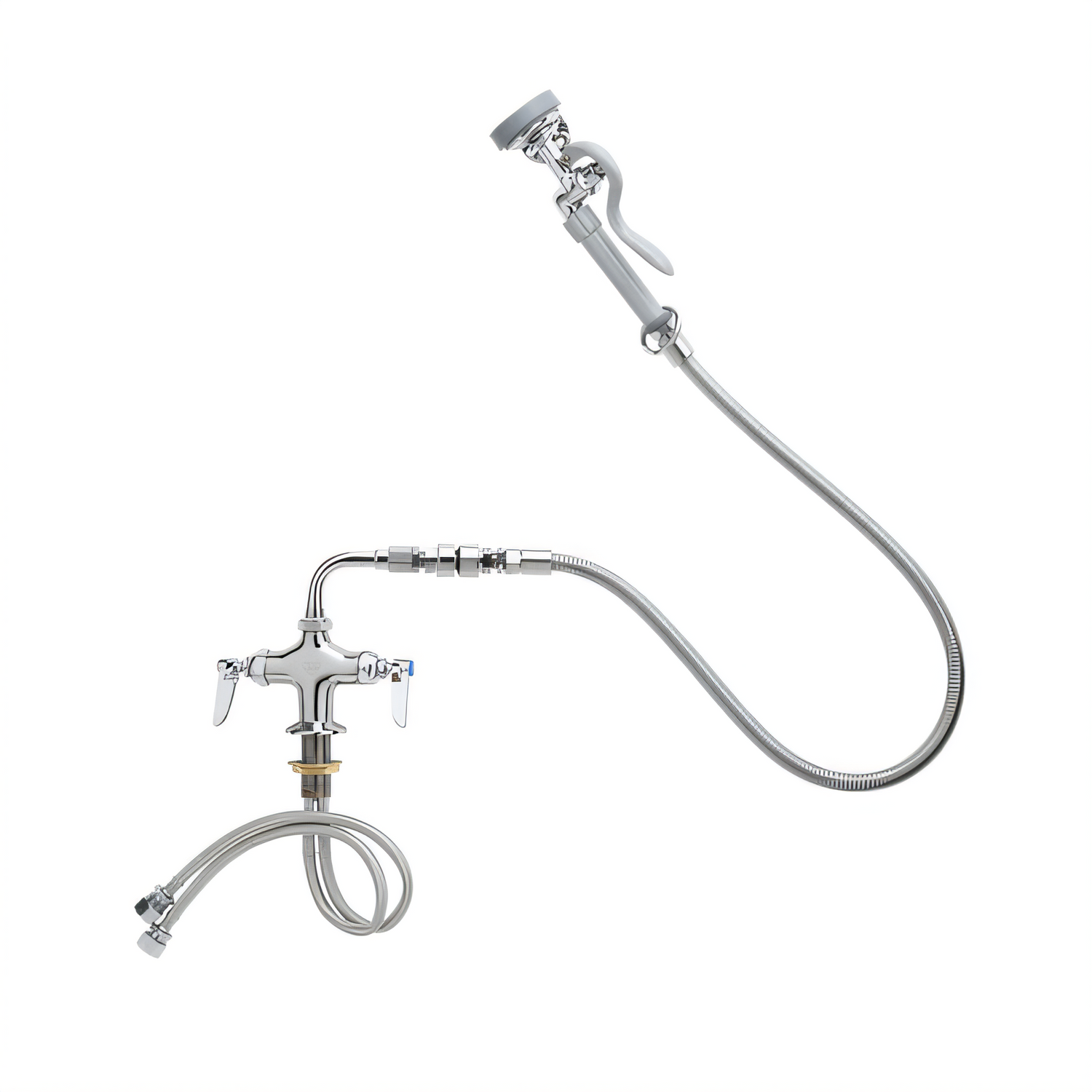 Mixing Faucet Kit, single, deck mounted, includes: angled spray valve 1.42 gpm (B-107-035), (2) 150A optional tailpiece & nut for 1/4" NPT connection, vacuum breaker, Eterna cartridges with spring checks & lever handles with color coded indexes, 90° swivel adapter, 44" stainless steel flex hose, dummy wall hook with (2) plated screws & 4" spreader with 1/2" NPT male inlets