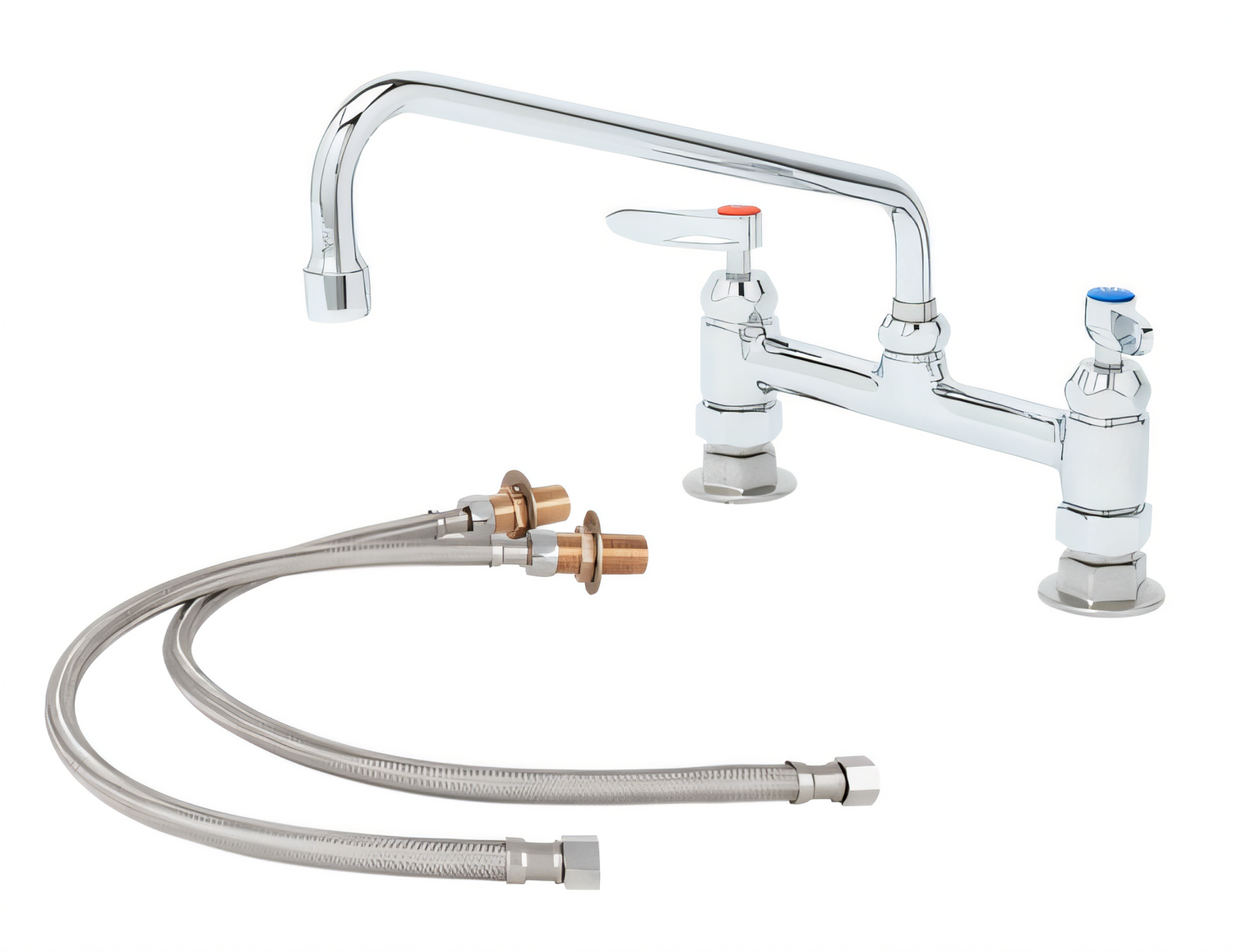 Pantry Faucet, double, deck mount, 8" deck mount mixing faucet with polished chrome plated brass body, 12" swing nozzle with stream regulator outlet, ceramic cartridges with check valves, lever handles, and 1/2" NPT female inlets, certified to ASME A112.18.1/CSA B125.1, NSF 61-Section 9 and NSF 372. Meets ADA ANSI/ICC A117.1 requirements