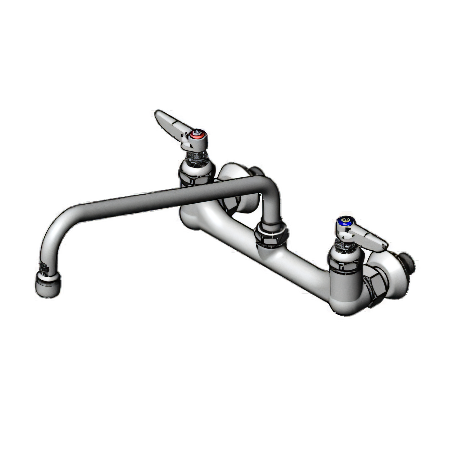 T&S Brass B-0231-EE-A22 double pantry faucet — wall-mount with 8" centers and a 12" swing nozzle for flexible use. Features lever handles with quarter-turn Eterna cartridges, adjustable flange, 2.2 GPM aerator, 1/2" NPT connections, low-lead construction and ADA compliance. Durable commercial-grade design ideal for restaurants, kitchens and utility rooms.