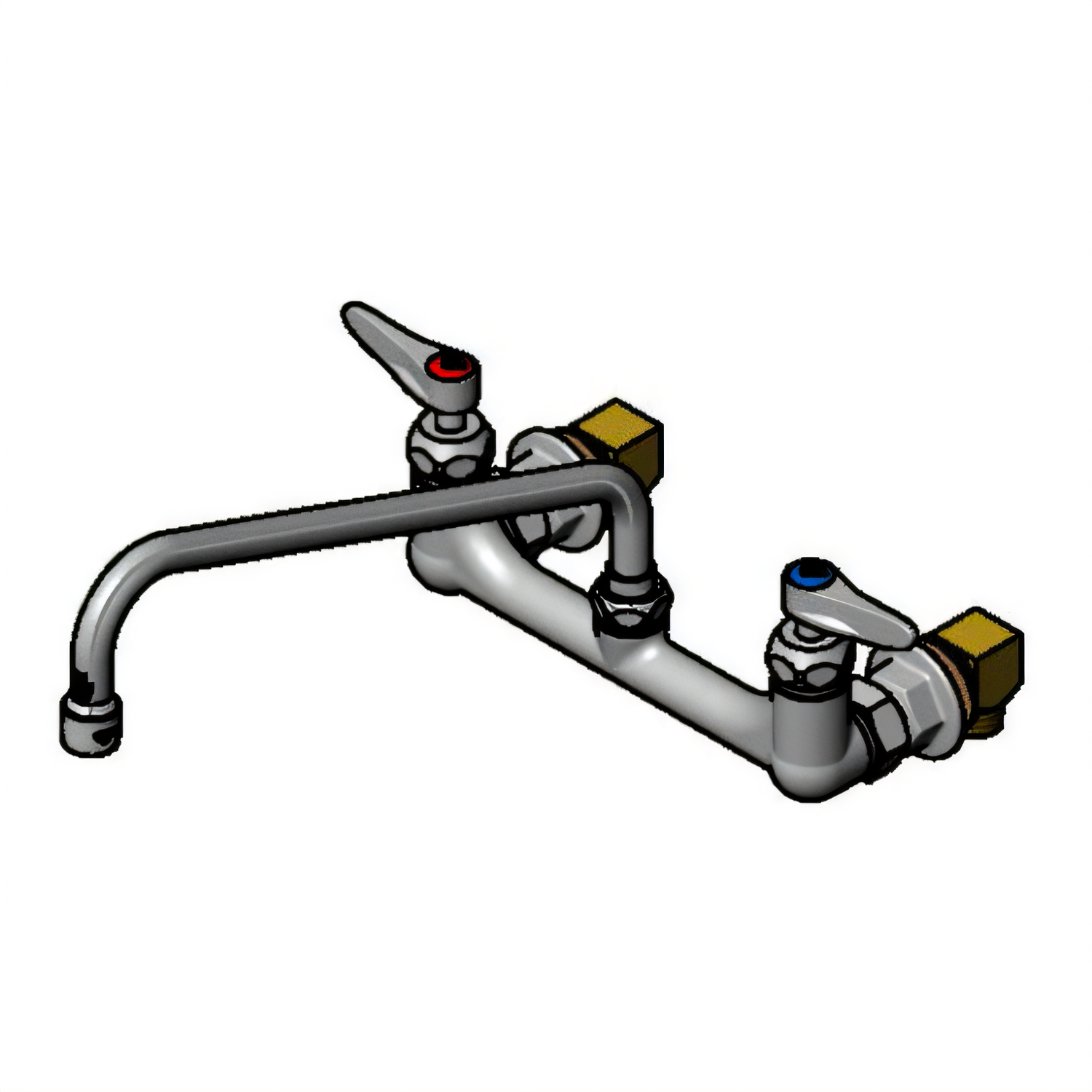 Double Pantry Faucet, double hole base, wall mount mixing faucet with 8" centers, quarter-turn Eterna cartridges with spring checks, lever handles with color coded indexes, 12" swing nozzle with stream regulator, (2) 24" stainless steel hoses, chrome plated brass body, includes lock washer & 1/2" NPT male elbow installation kit (B-230-KIT), low lead, ADA Compliant, cCSAus