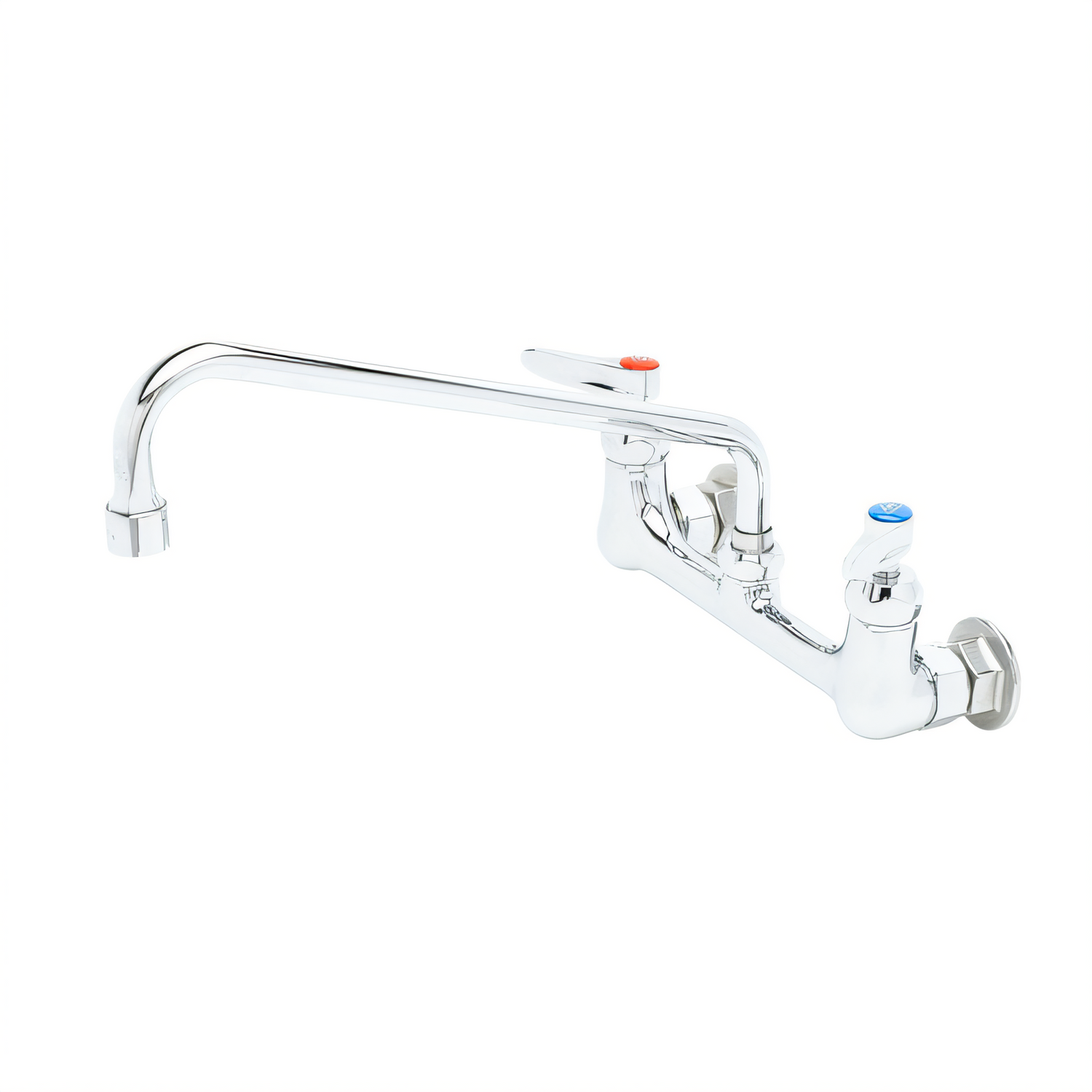 Mixing Faucet, wall mount, 8" adjustable centers, quarter-turn Cerama cartridges with check valves, lever handles with color-coded indexes, 12" swing nozzle with vandal resistant 2.2 GPM aerator, includes lock washer for rigid application, polished chrome-plated brass body, 1/2" female inlets, 1/2" male supply elbows, low lead compliant, ADA Compliant, cCSAus