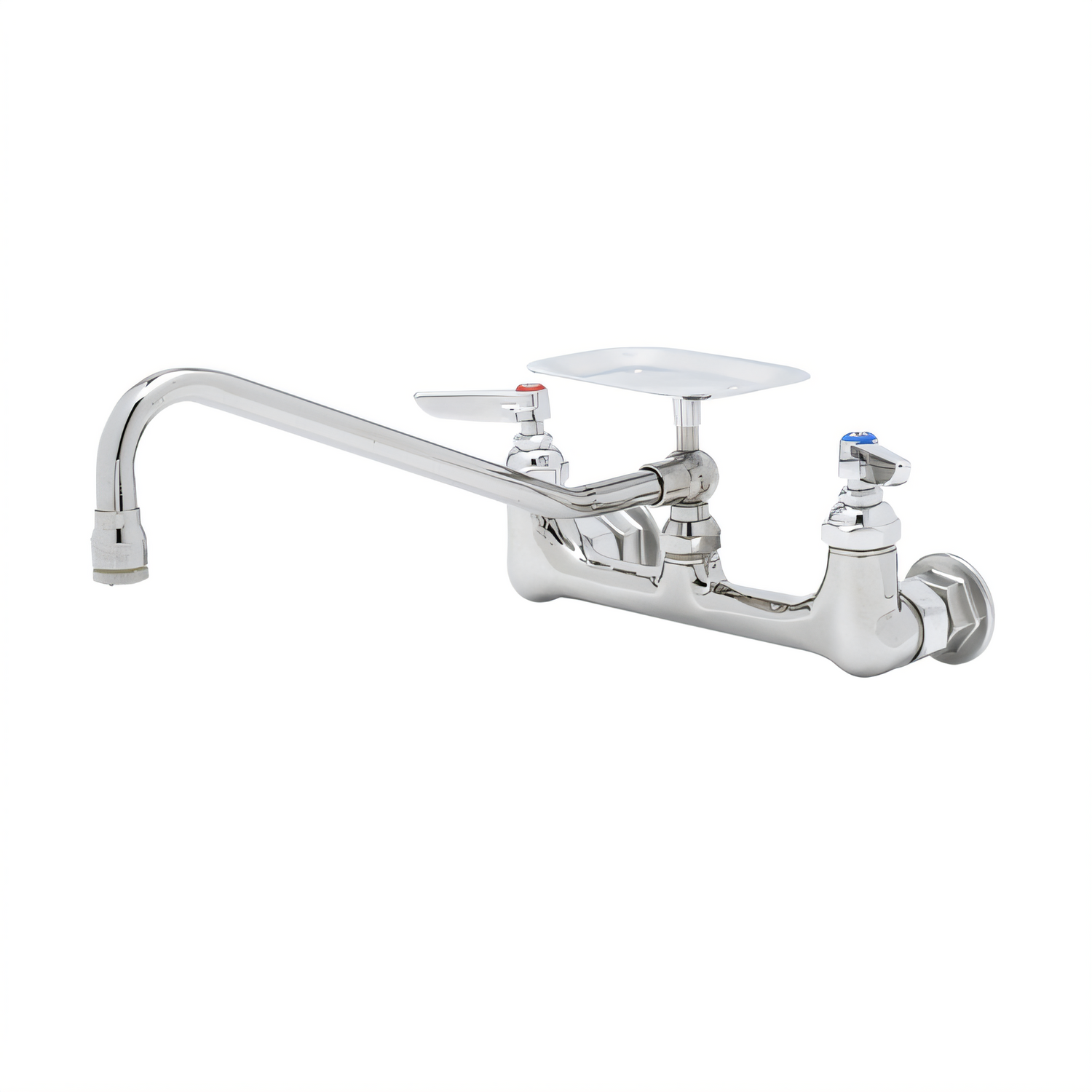 Mixing Faucet, wall mounted, 8" adjustable centers, 8" swing nozzle with stream regulator outlet, lever handles with color coded indexes, attached soap dish, 1/2" NPT female inlets, quarter-turn Eterna cartridges, low lead, ADA Compliant
