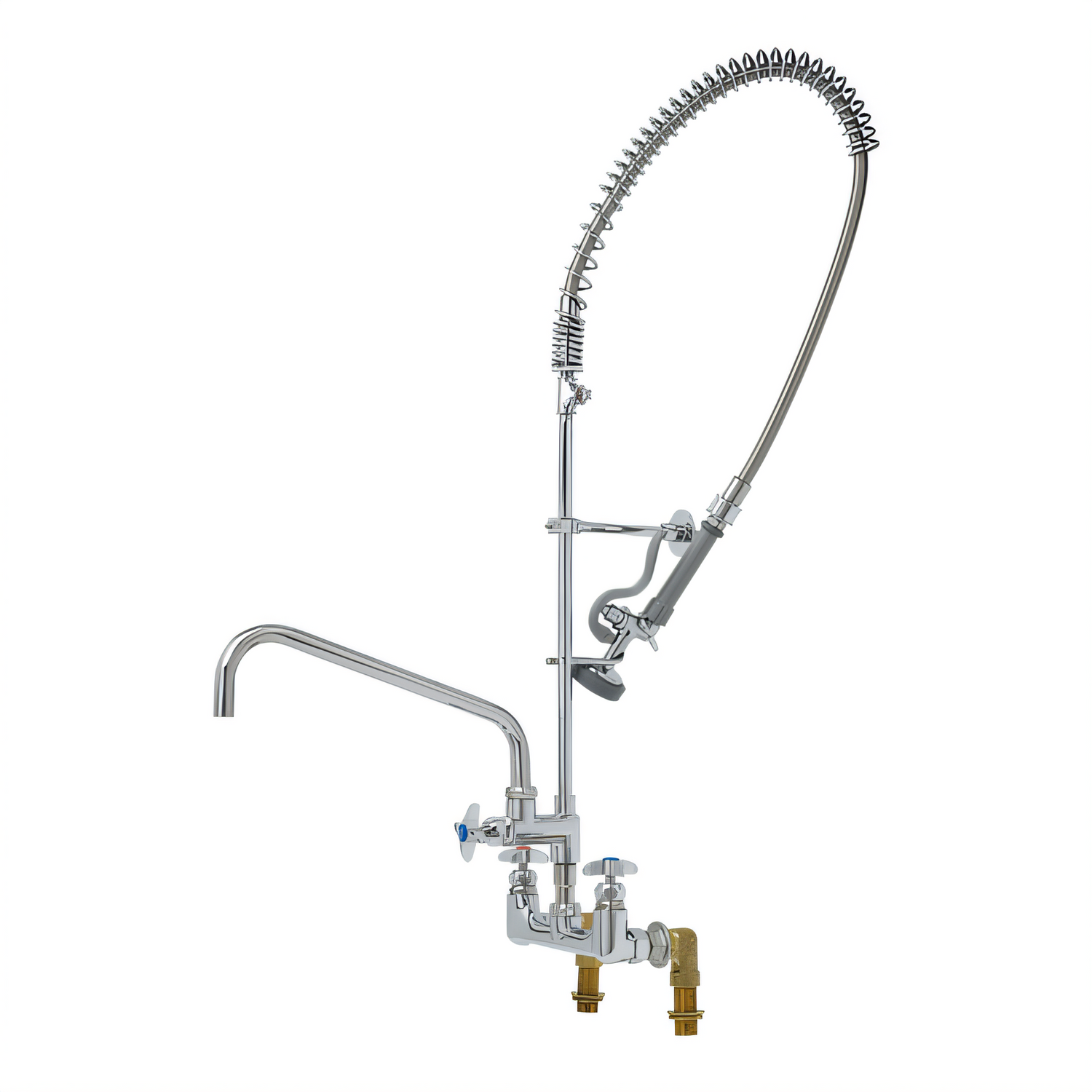 EasyInstall Big-Flo Pre-Rinse Unit, wall mount, mixing faucet with 8" adjustable centers, check valves, Big-Flo 14" add-on swing nozzle & compression spindles, 4-arm handles with color coded indexes, 18" riser, 44" stainless steel hose with heat resistant handle & hold down ring, inlet supply nipples, 6" wall bracket, accessory fitting tee, 1.15 GPM spray valve, 3/4" NPT, low lead, cCSAus