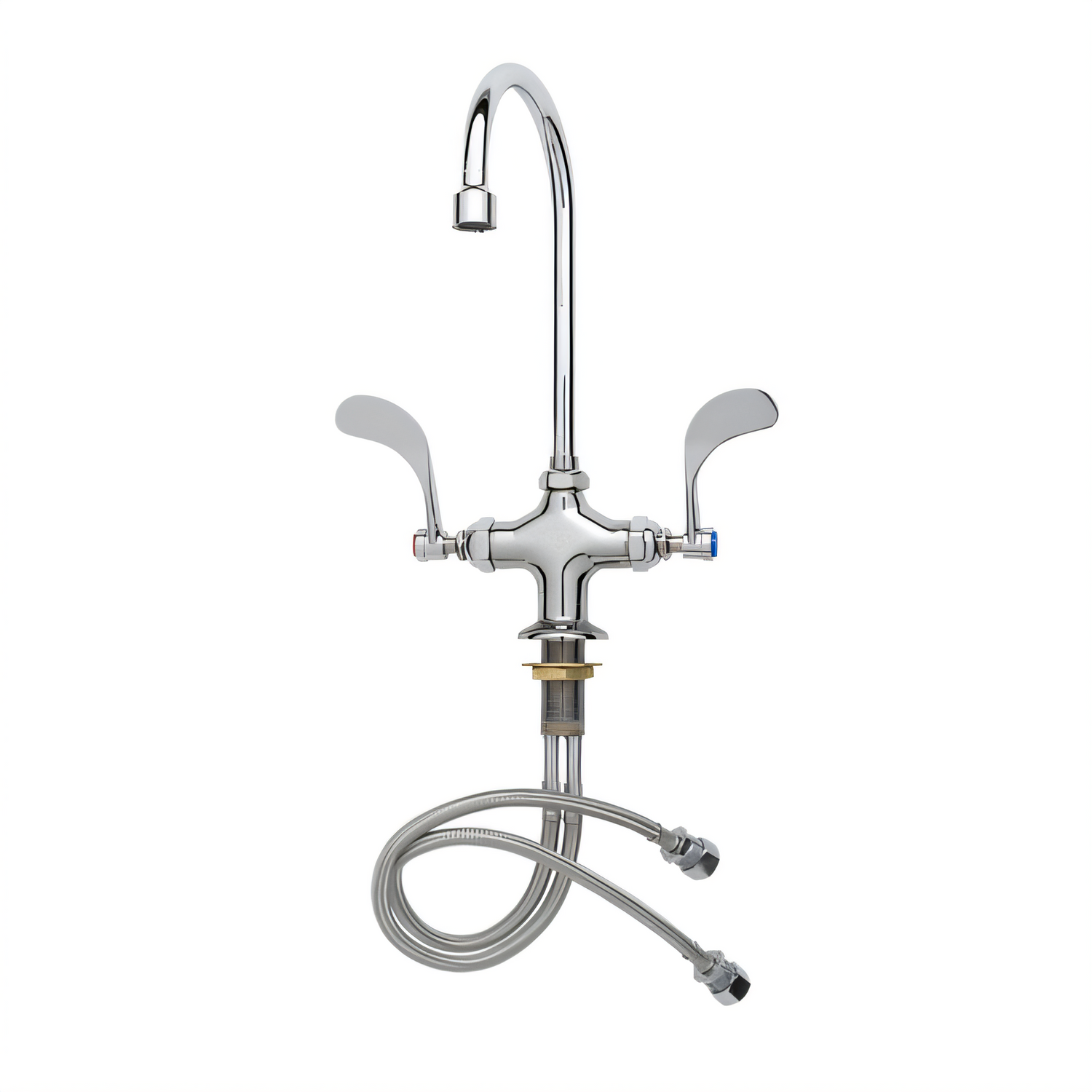 Double Pantry Faucet, deck mount, single hole base, 6" swivel gooseneck, 4" wrist handle, 18" stainless steel flex hose, quarter-turn compression cartridge, vandal resistant, 1.5 GPM aerator, 1/2" NPT, ADA Compliant