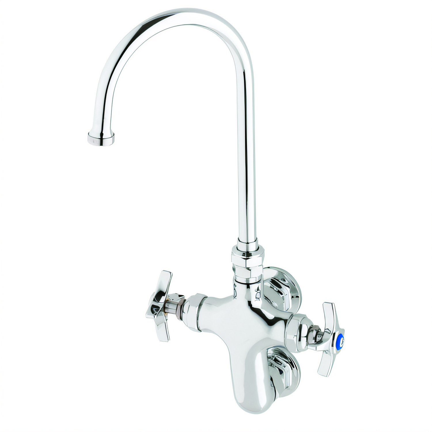 Double Pantry Faucet, splash-mounted, swivel gooseneck nozzle, with four-arm handles, 1/2" IPS female flanged inlet, 3" vertical centers, quarter-turn Eterna cartridges, low lead, ADA Compliant