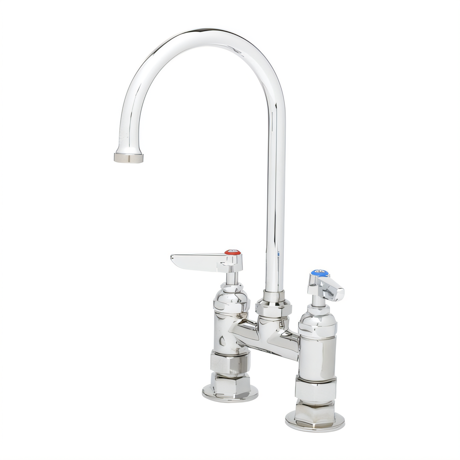Mixing Faucet, deck mount, 4" adjustable centers, 6" swivel gooseneck spout with Series 1 stream regulator outlet (includes lock washer to convert to rigid), lever handles with color-coded indexes, quarter-turn Eterna compression cartridges with spring checks, polished chrome-plated brass body & tubular spout, 1/2" NPT female inlets, low lead, cCSAus, ADA Compliant(replaces B-0326)