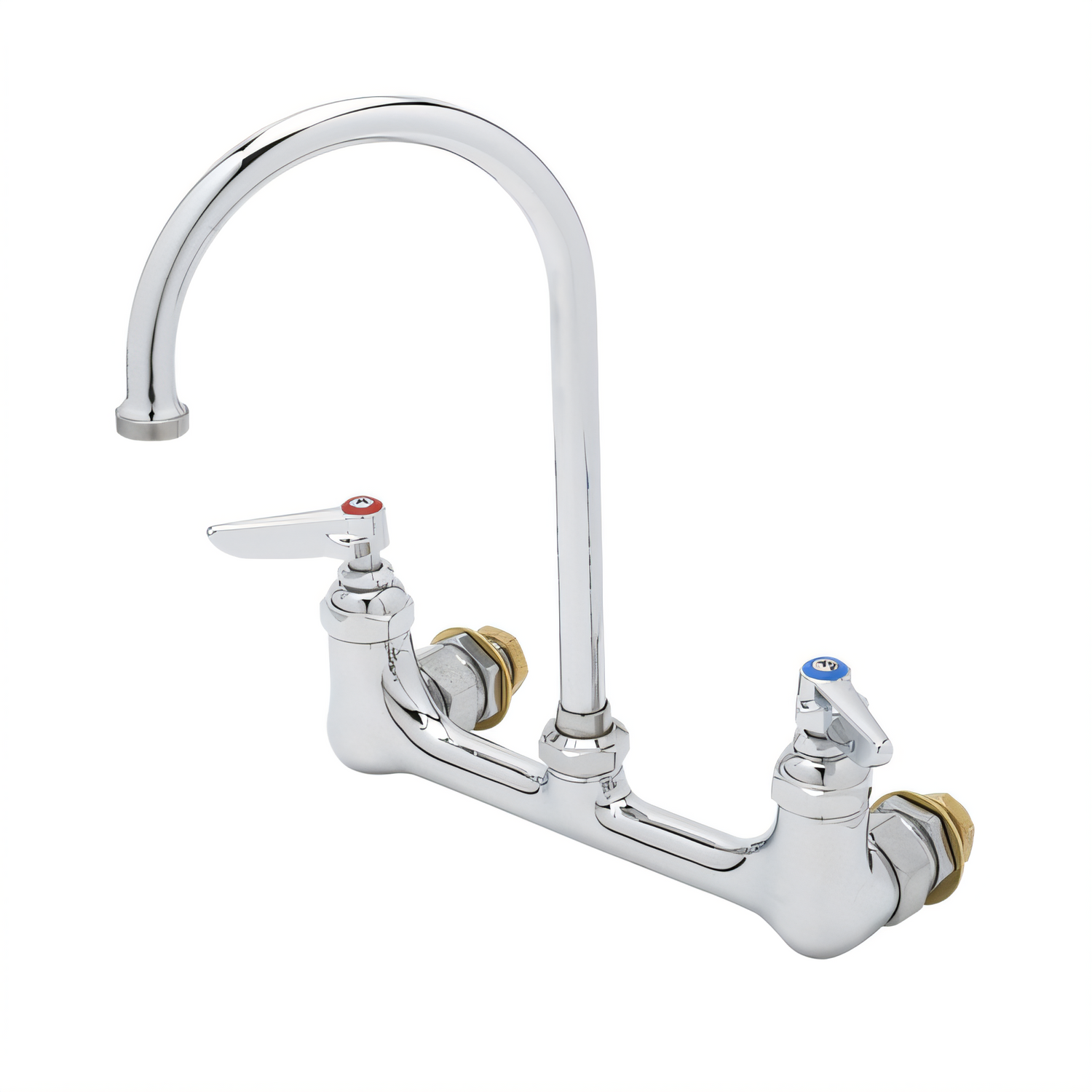 Faucet, wall mount, 8" adjustable centers, 5-3/4" swivel gooseneck (with lock washer for rigid application), quarter-turn Eterna compression cartridges with spring checks, lever handles with color coded indexes, polished chrome-plated brass faucet body, 1/2" NPT female inlets, cCSAus, ADA Compliant