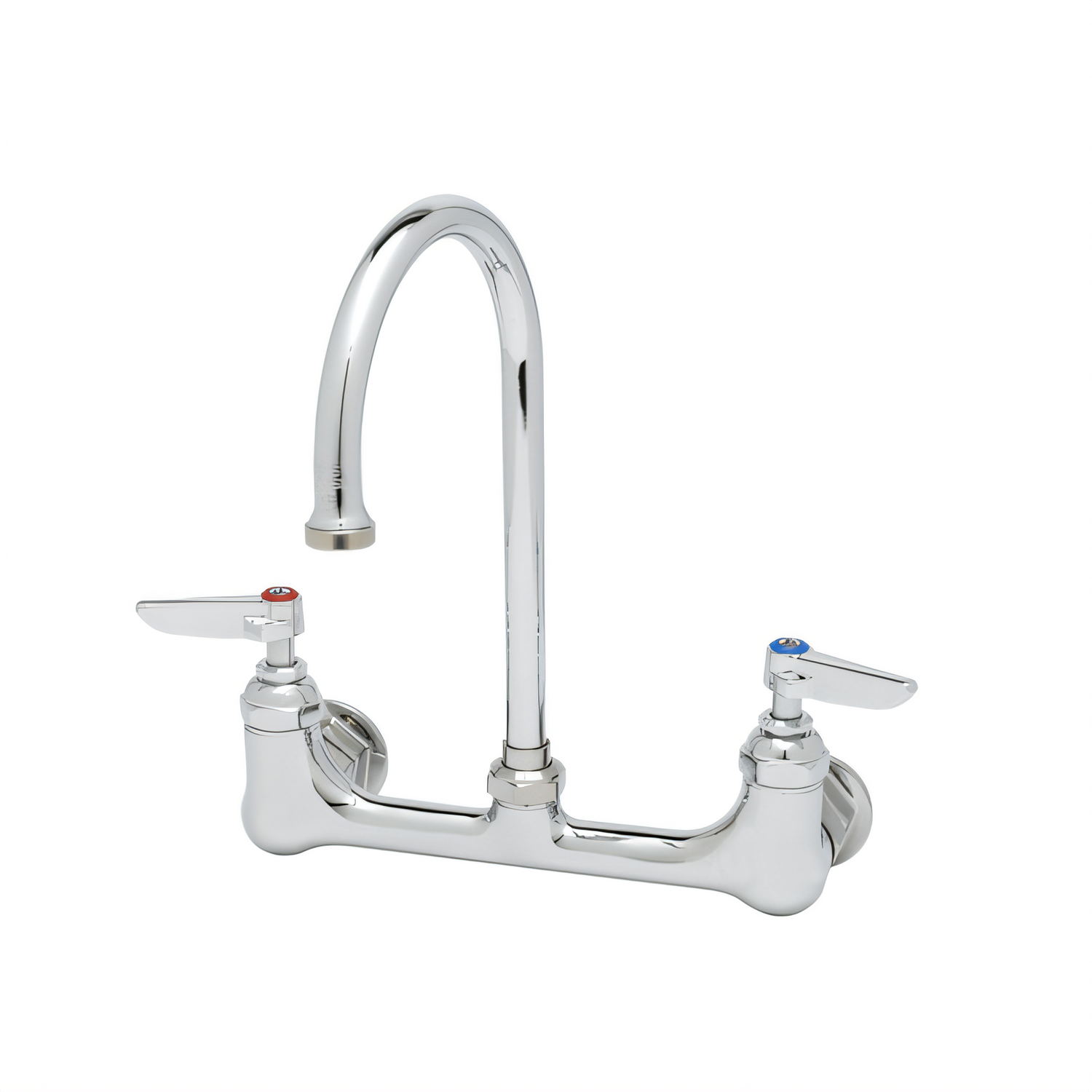 Faucet, wall mount, 8" adjustable centers, 6" swivel gooseneck (with lock washer for rigid application), quarter-turn cerama cartridges with check valves, lever handles with color coded indexes, polished chrome-plated brass faucet body, 1/2" NPT female inlets, cCSAus, ADA Compliant