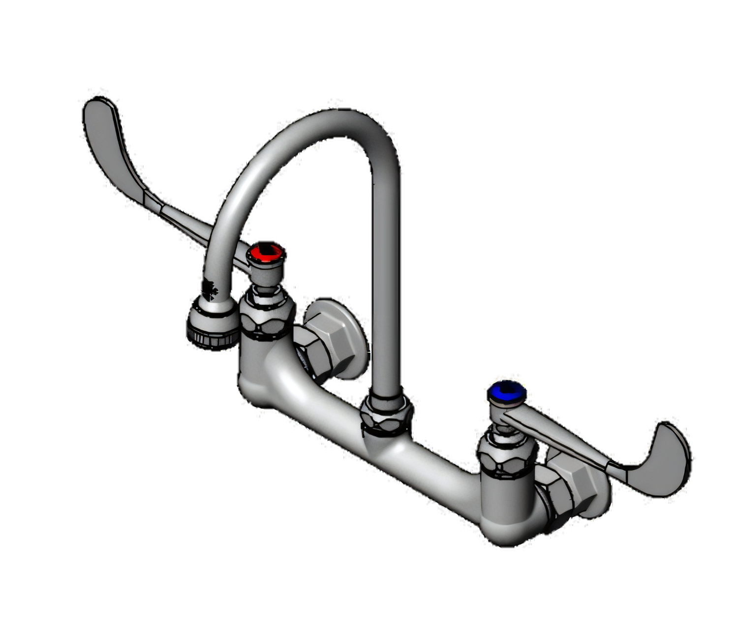 Surgical Sink Mixing Faucet, wall mount, 8" adjustable centers, quarter-turn Eterna cartridges with spring checks, 6" wrist action handles with color coded indexes, 5-3/4" swivel/rigid gooseneck with (B-0103-01) rosespray outlet, includes lock washer for rigid application, chrome-plated brass faucet body, 1/2" NPT female inlets, CSA, ADA Compliant