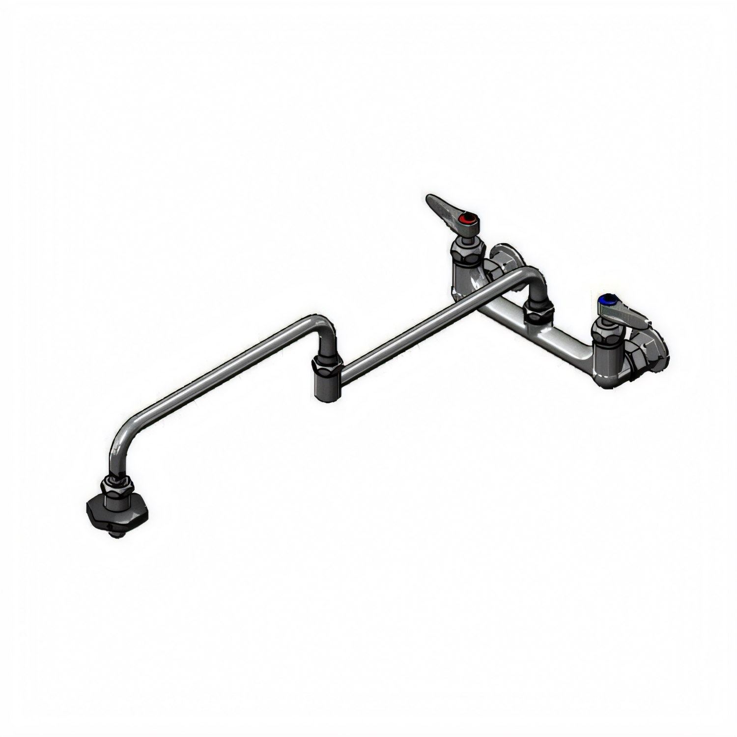 Pot Filler Faucet, wall mount, mixing faucet with 8" adjustable centers, 24" double-joint swing nozzle, quarter-turn Cerama cartridges, lever handles with color coded indexes, insulated on/off control valve at outlet, chrome plated brass body, 1/2" NPT female inlets, low lead, cCSAus