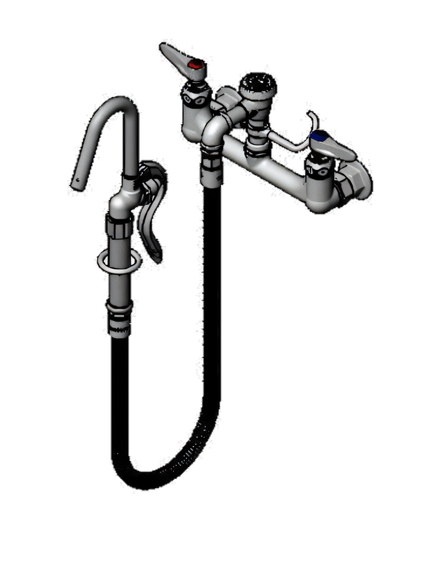 Pot & Kettle Filler Faucet, wall mount mixing faucet with 8" adjustable centers, quarter-turn Eterna cartridges with spring checks, lever handles with color coded indexes, 3/8" NPT atmospheric vacuum breaker (B-0968), 36" flexible stainless steel hose with heat-resistant gray handle & hold down ring, hook nozzle with self-closing valve, finger hook, polished chrome-plated brass faucet body, 1/2" NPT female inlets, CSA