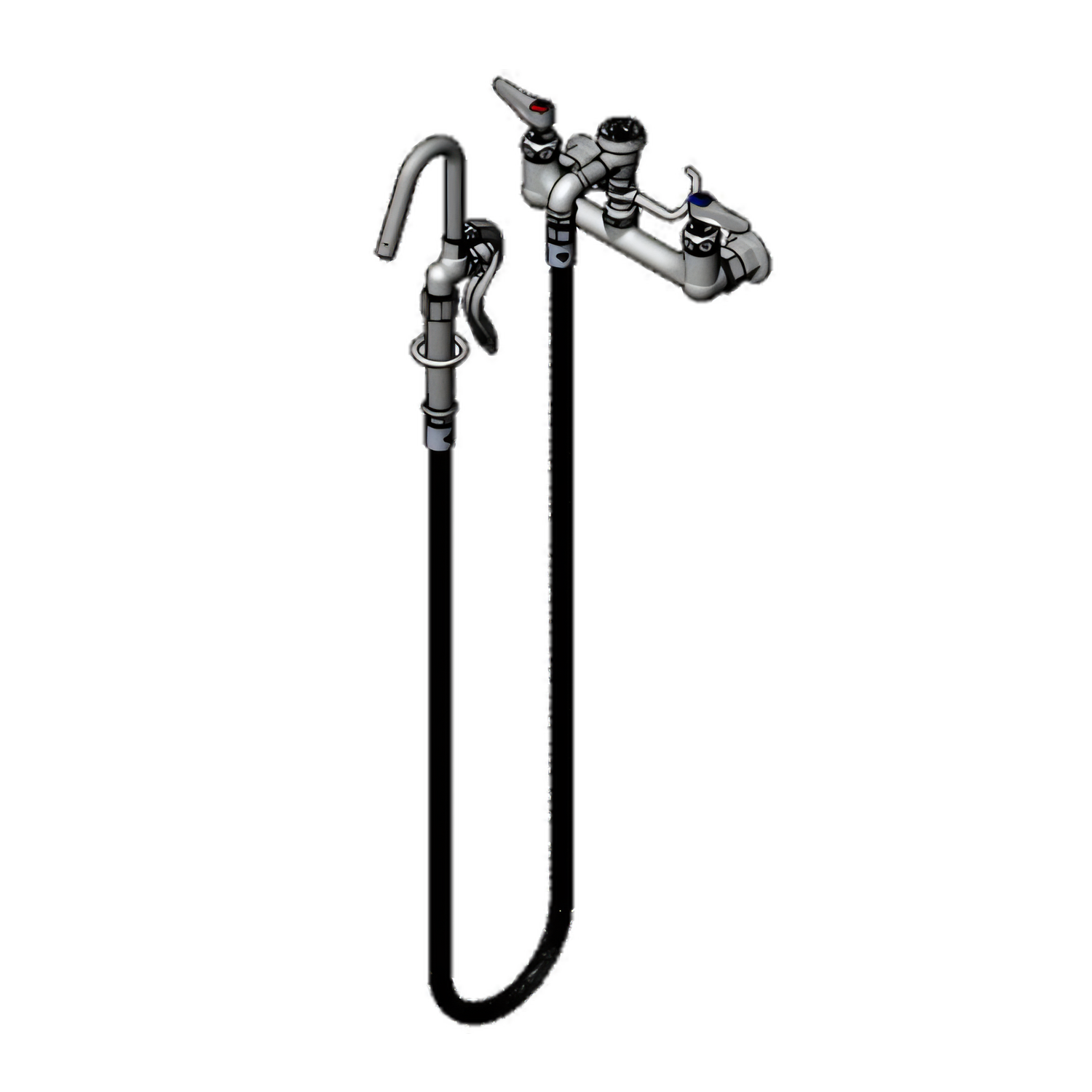 Pot & Kettle Filler Faucet, wall mount mixing faucet with 8" adjustable centers, quarter-turn Eterna cartridges with spring checks, lever handles with color coded indexes, 3/8" NPT atmospheric vacuum breaker (B-0968), 68" flexible stainless steel hose with heat-resistant gray handle & hold down ring, hook nozzle with self-closing valve, finger hook, polished chrome-plated brass faucet body, 1/2" NPT female inlets, CSA
