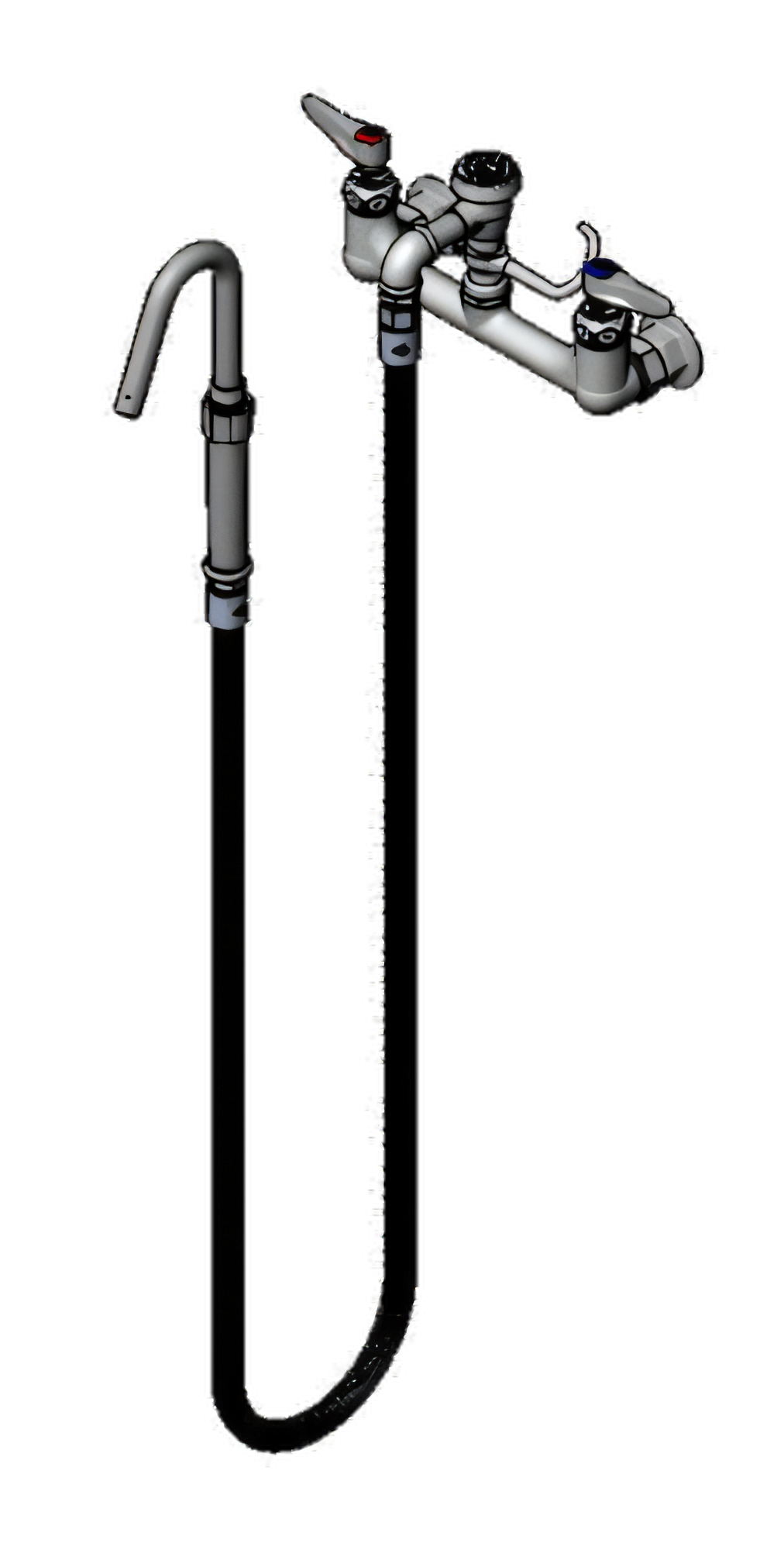 Pot & Kettle Filler Faucet, wall mount mixing valve with 8" adjustable centers, quarter-turn Eterna cartridges with spring checks, lever handles with color coded indexes, 3/8" NPT atmospheric vacuum breaker, 68" flexible stainless steel hose with heat-resistant gray handle, hook nozzle, finger hook, polished chrome-plated brass faucet body, 1/2" NPT female inlets, CSA