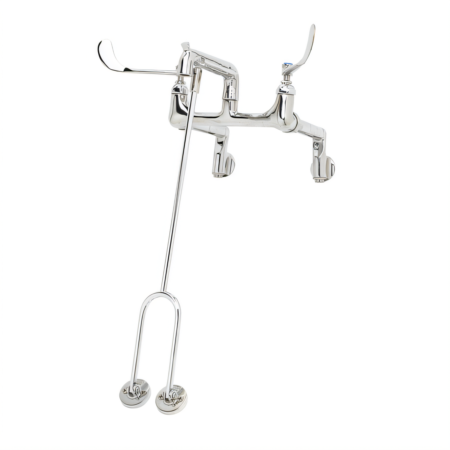 Service Sink Faucet, 8" centers, 5-1/4" clearance wall to center line of faucet, 9-5/16" from wall to center of outlet, 6" wrist action handles, 00XX flanges, integral stops, polished chrome-plated finish, bottom support wall brace