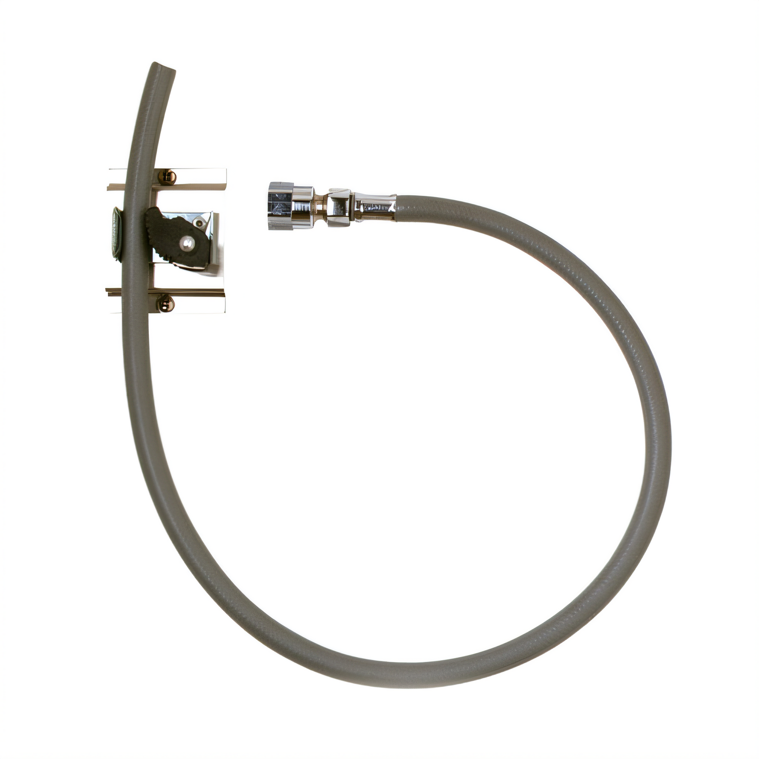 Stainless steel hose bracket with spring-loaded rubber grip, includes 30" rubber hose, 3/4" female inlet & mounting screws for secure setup.