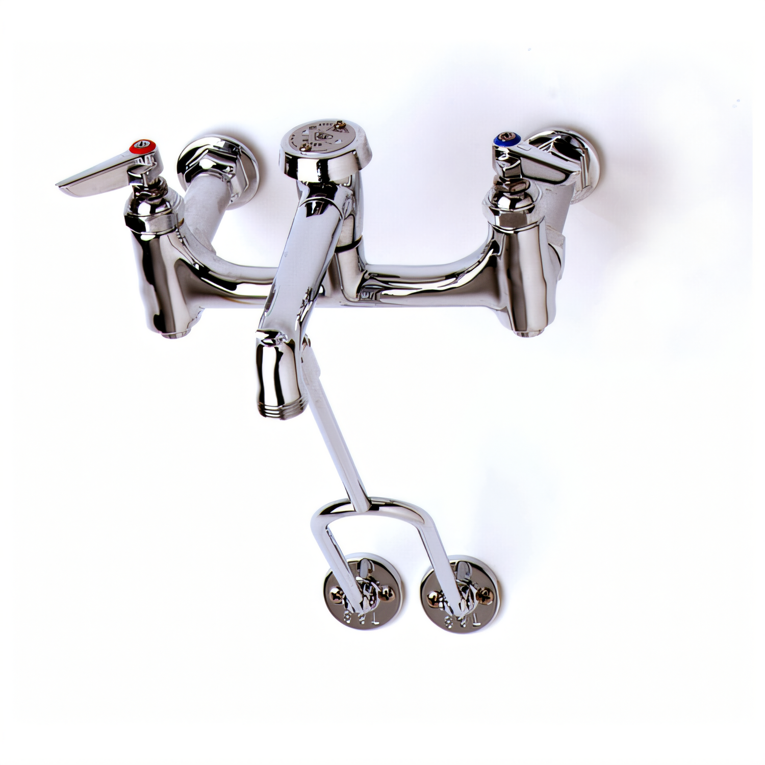 Service Sink Faucet, 8" centers, wall mount, lever handles, vacuum breaker, built-in-stops, polished chrome finish, 1/2" NPT, quarter-turn Cerama cartridges, low lead, ADA Compliant