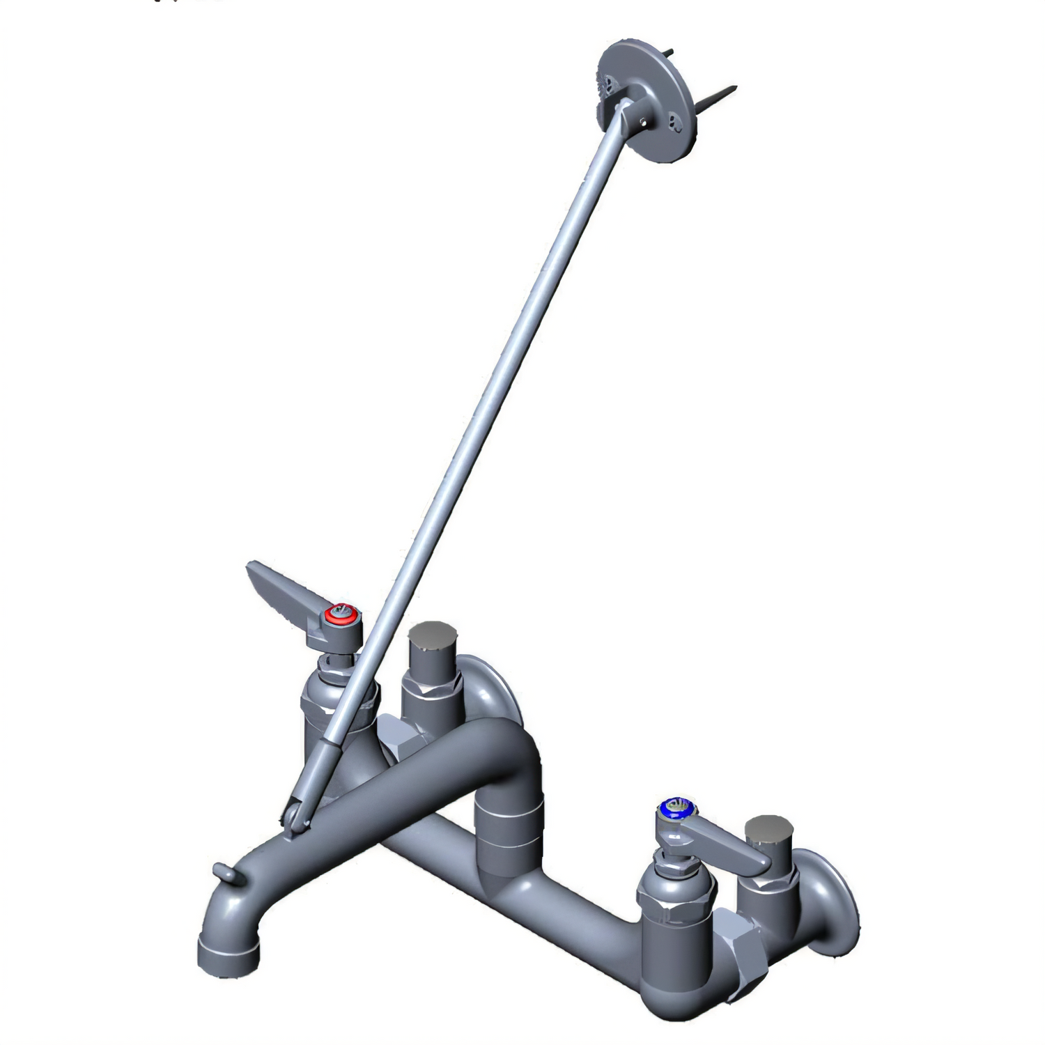 Service Sink Faucet, 8" centers, 9" from back of inlets to center of outlet, brace adjustable for mounting up to 2-1/2" behind inlets, polished chrome-plated finish, top support wall brace, integral stops 10" from back of inlets to center of outlet