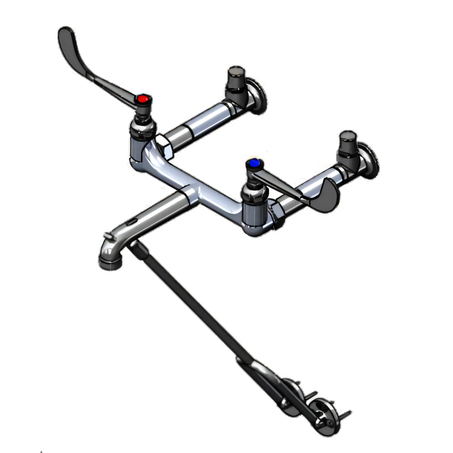 Service Sink Faucet, 8" centers wall mount mixing faucet with polished chrome plated brass body, polished chrome plated brass spout with pail hook and plain end outlet, compression cartridges with spring checks, 6" wrist action handles, 1/2"NPT female extension inlets, loose key stops and lower support rod. Certified to ASME A112.18.1/CSA B125.1, NSF 61-Section 9 and NSF 372. Meets ADA ANSI/ICC A117.1 requirements.
