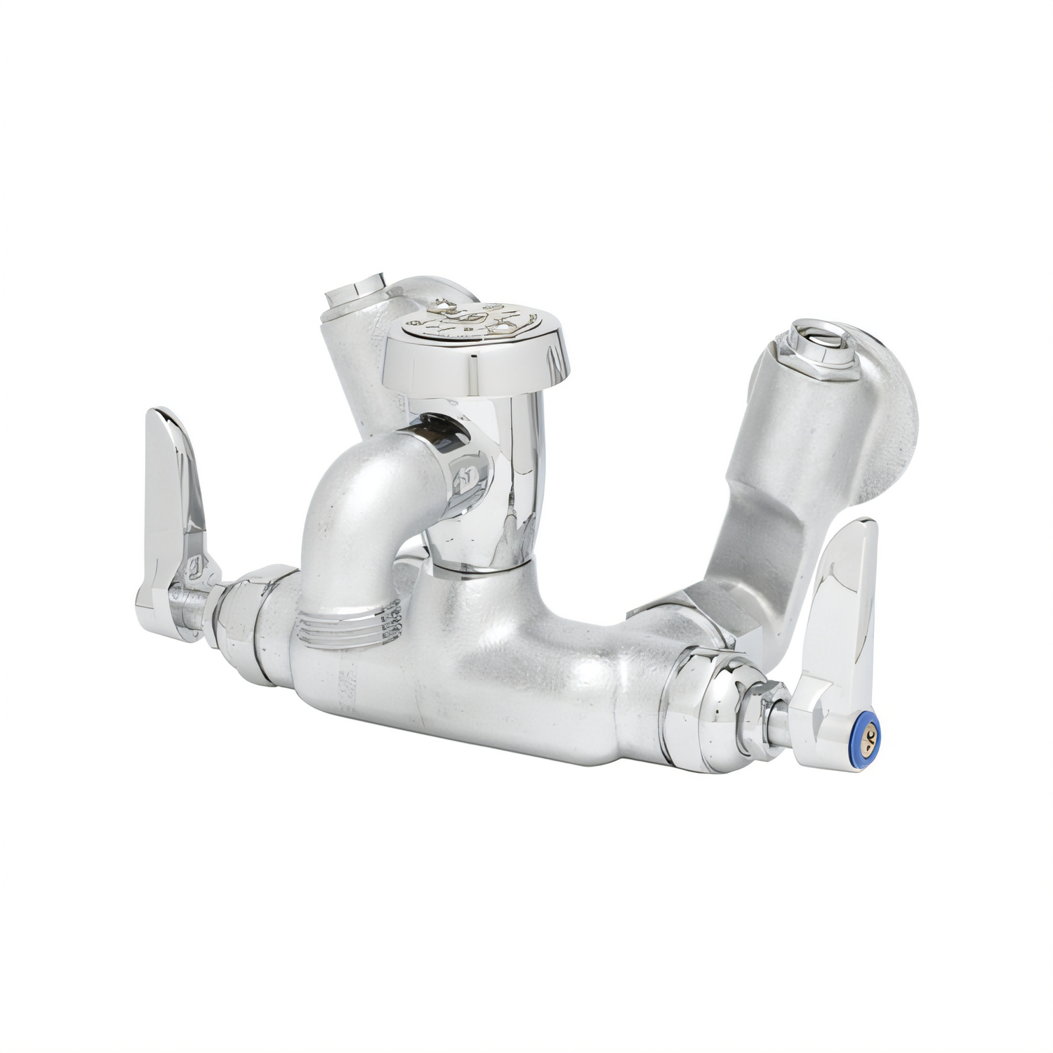 Service Sink Faucet, wall mount, 1/2" NPT vacuum breaker, spout with garden hose male outlet, Eterna cartridges with spring checks, lever handles with color coded indexes, 1/2" adjustable NPT female inlets (2-1/4" to 8-1/4" below or above centerline), built-in service stops, rough chrome finish on body & spout, ADA Compliant