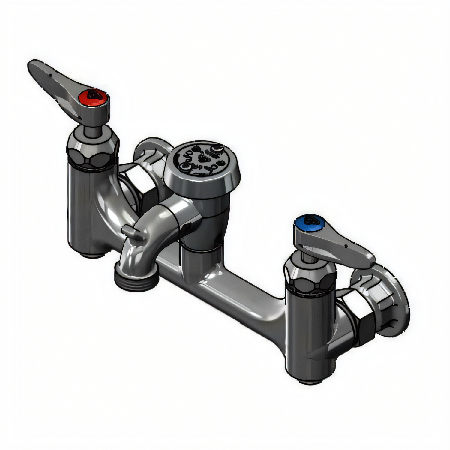 Service Sink Faucet, wall mount, 8" centers, vacuum breaker spout with pail hook & garden hose outlet, lever handles with color coded indexes, quarter-turn Cerama cartridges with check valves, built in stops, polished chrome plated brass, 1/2" NPT female inlets, low lead, NSF, cCSAus, ADA Compliant