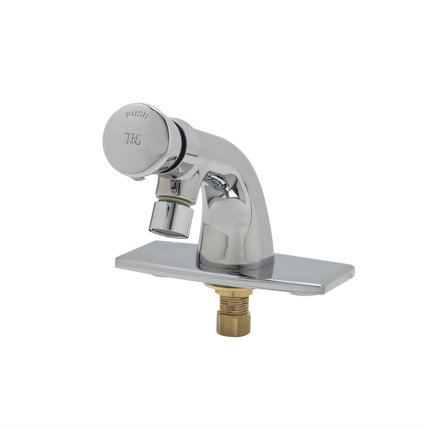 Slow Self-Closing Faucet, heavy duty, push button, 1/2" NPS threaded shank, 1/2" O.D. slip inlet, approximately 5-1/2"H, center of inlet to aerator outlet is 3-3/4", outlet 2" above deck, specify H or C or blank, vandal proof pins