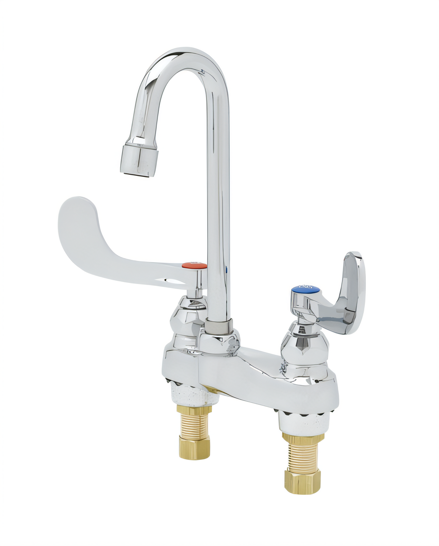 Mixing Faucet, deck mount, 4" centers, polished chrome plated brass body, 2 -7/8" swivel/rigid gooseneck with 0.5 GPM vandal resistant non- aerated spray device, Eterna compression cartridges with spring checks, 4" wrist action handles, vandal resistant handle screws, 1/2" NPSM male inlets with compression nuts, ADA Compliant