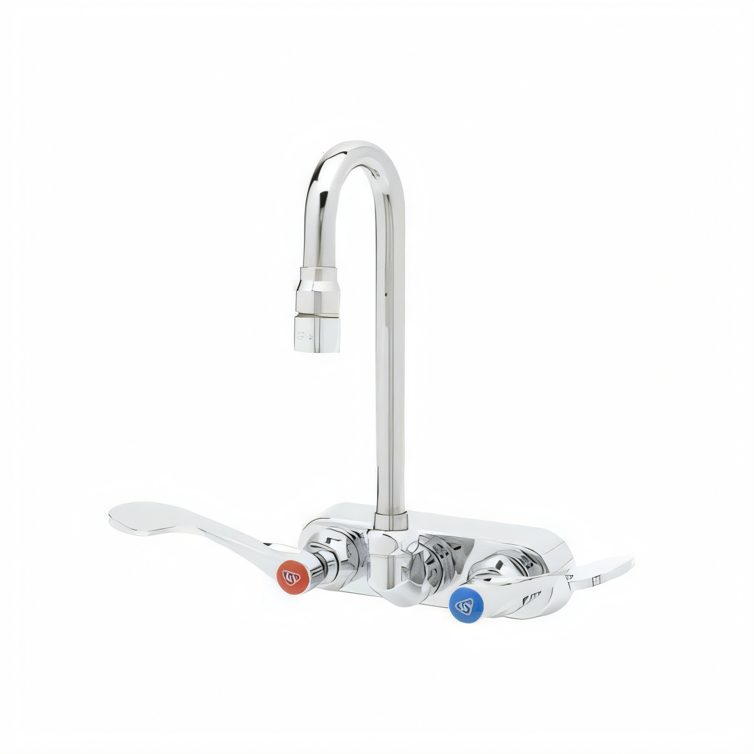 Workboard Faucet, wall mount, 4" centers, 2-11/16" swivel gooseneck nozzle with 2.2 GPM VR aerator, quarter-turn Eterna cartridges with spring checks, 4" wrist action handles with color coded indexes, 1/2" NPT male inlet elbows, low lead, cCSAus, ADA Compliant, NSF