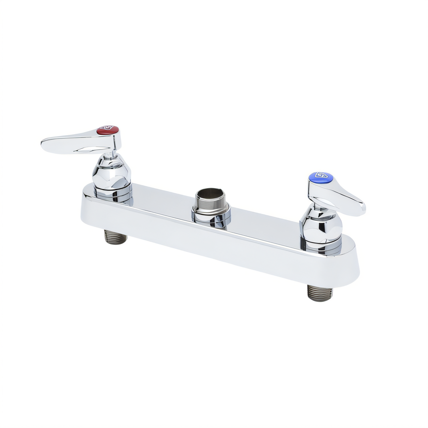 Workboard Faucet (Less Nozzle), deck mount with 8" centers, quarter-turn Cerama cartridges with check valves, lever handles with color-coded indexes, swivel outlet (accepts T&S nozzles), includes tailpieces & nuts for 1/4" NPT male connection, chrome-plated brass faucet body, 1/2" NPT male inlets, CSA, ADA Compliant