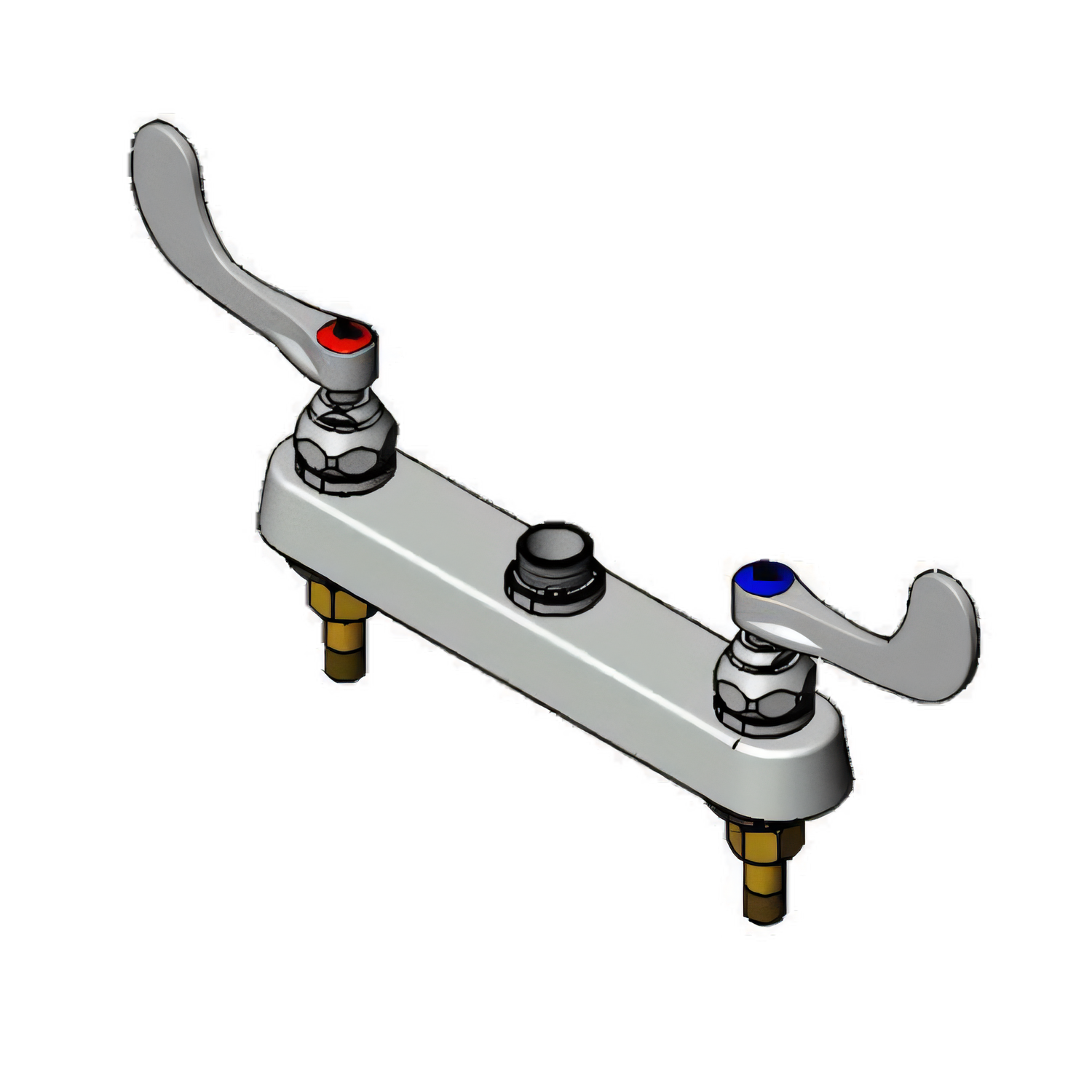 Workboard Faucet (Less Nozzle), deck mount with 8" centers, quarter-turn Eterna cartridges with spring checks, 4" wrist handles with color-coded indexes, swivel outlet (accepts T&S nozzles), includes tailpieces & nuts for 1/4" NPT male connection, chrome-plated brass faucet body, 1/2" NPT male inlets, CSA, ADA Compliant