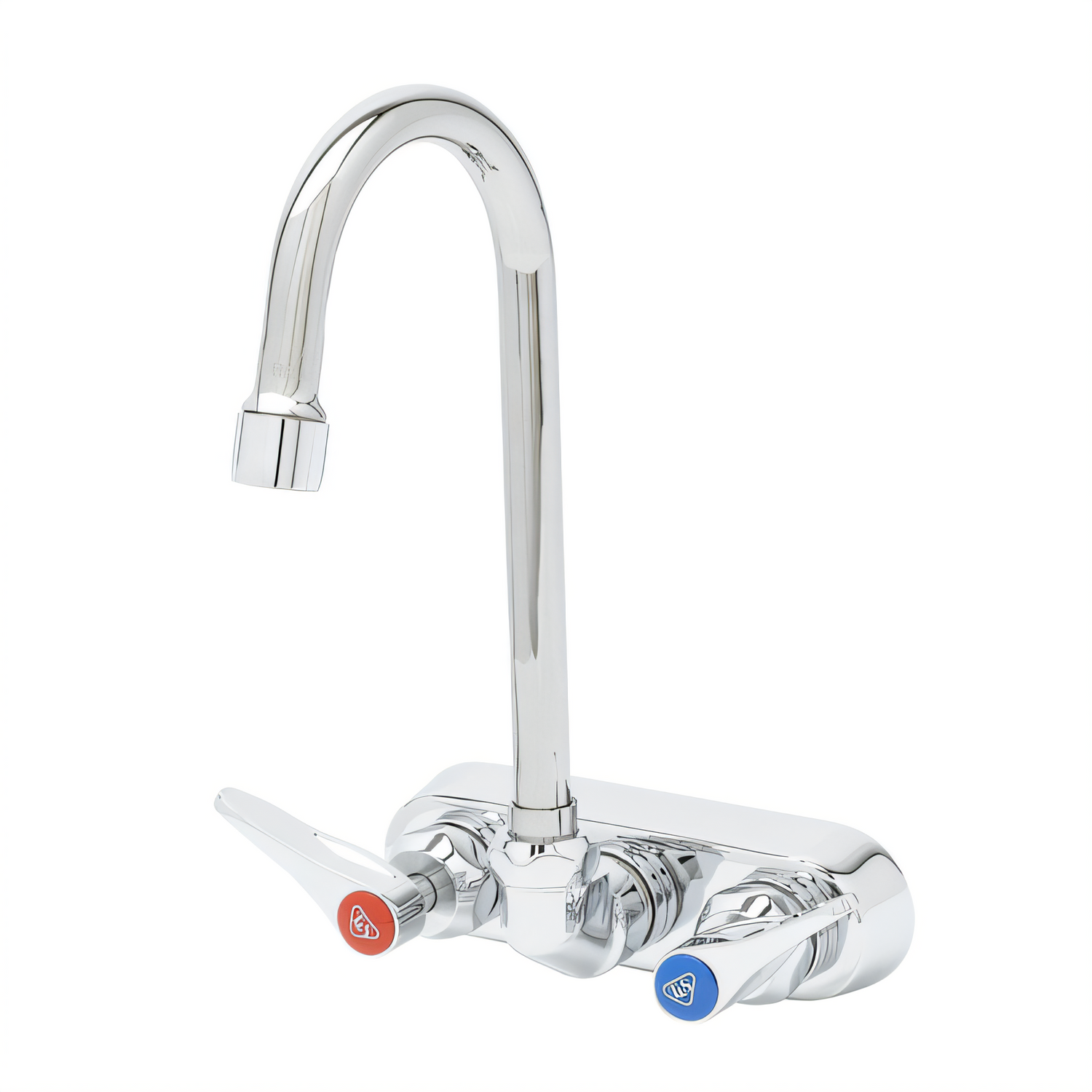 Workboard Faucet, wall mount, 4" centers, 4-3/8" swivel/rigid gooseneck nozzle (includes lock washer to convert to rigid), 2.2 GPM aerator, lever handles with color-coded indexes & anti-microbial coating, quarter-turn Cerama cartridges with check valves, 1/2" NPT male inlets, low lead content, ADA Compliant