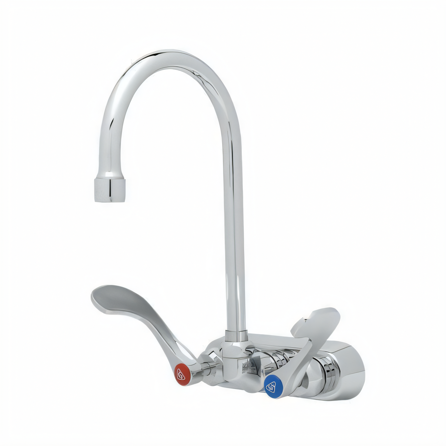 Workboard Faucet, wall mount, 4" centers, 5-3/4" swivel gooseneck nozzle, 1.0 GPM aerator, quarter-turn Cerama cartridges with check valves, 4" wrist blade handles with color-coded indexes, 1/2" NPT male inlets, ADA Compliant