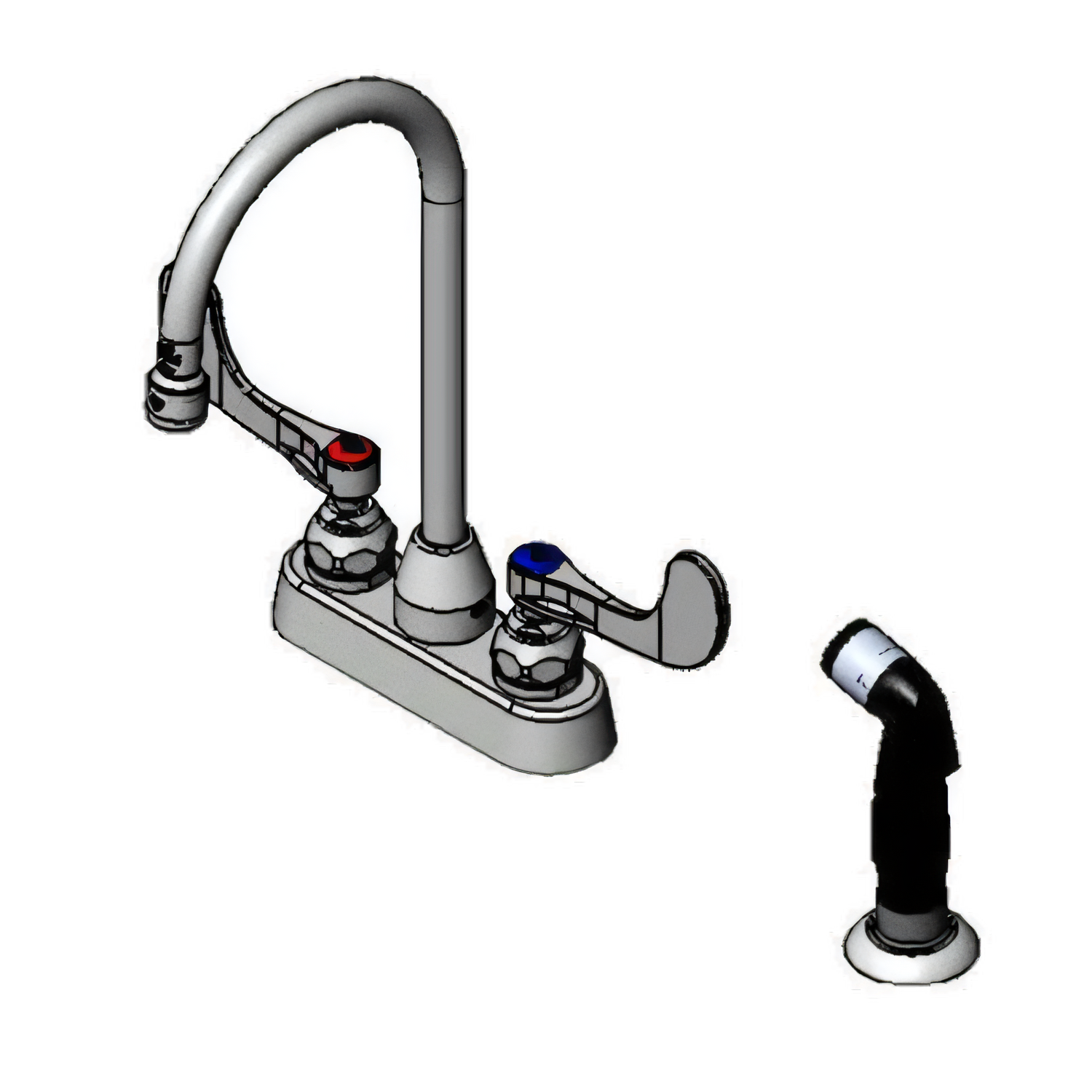 Faucet Workboard, deck mount, 4" center, gooseneck, diverter, side spray, wrist handles