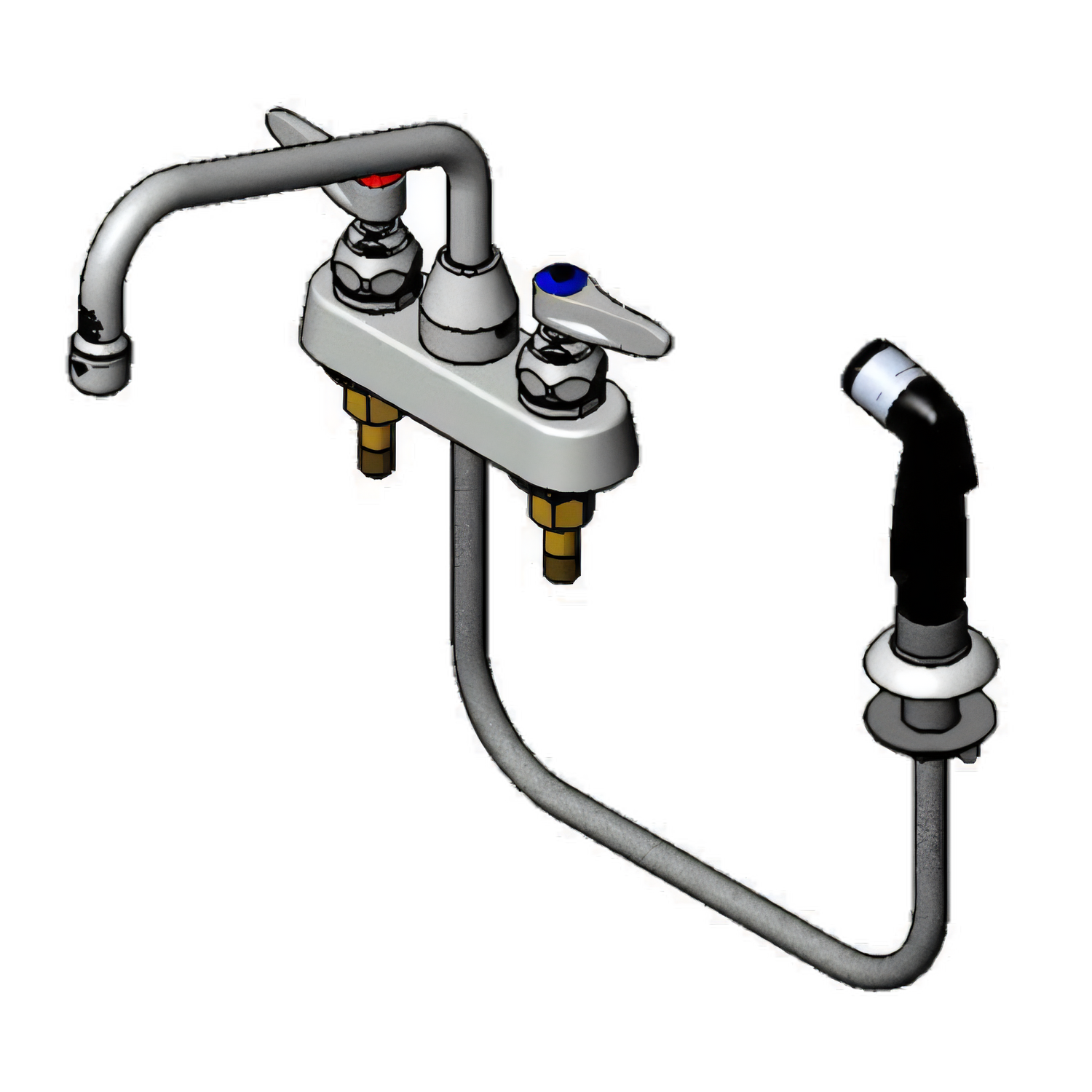 Lavatory Faucet, deck mounted, faucet on 4" centers, 8" swing spout, hose & spray, removable seats in faucet, four foot vinyl hose, automatic spray diverter, faucet automatically diverts water to spray when handle is used