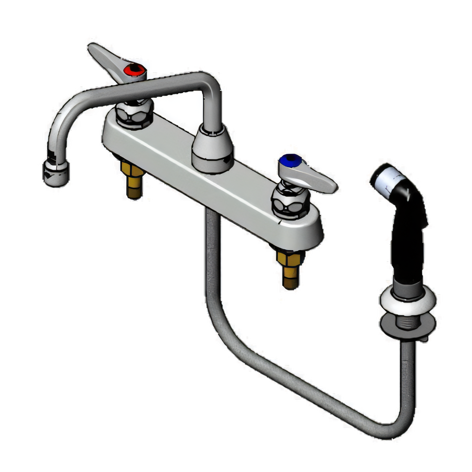 Lavatory Faucet, hose & spray, faucet on 8" centers with 8" swing spout, removable seats in faucet, four foot vinyl hose, automatic spray diverter, faucet automatically diverts water to spray when handle is used