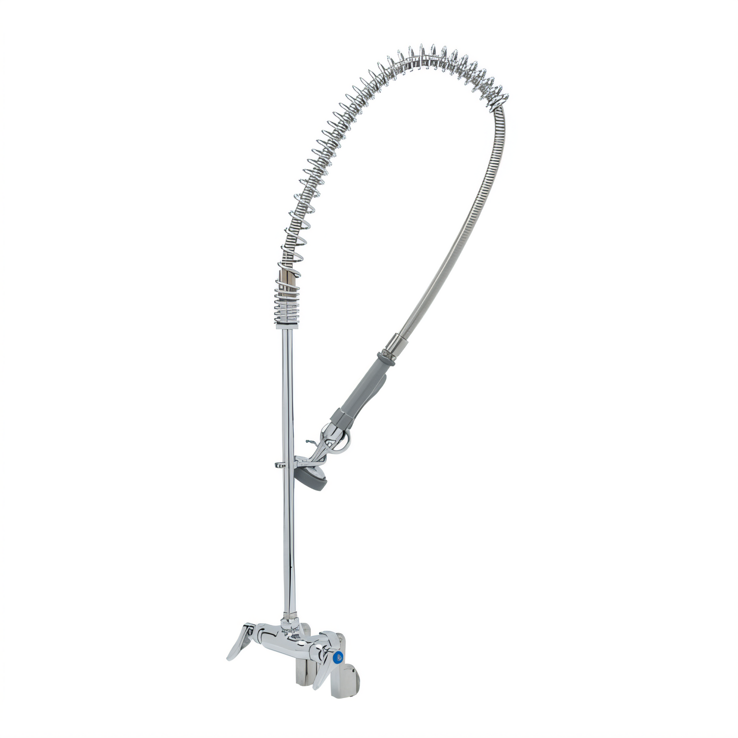 EasyInstall Pre-Rinse Unit, wall mount, adjustable inlet arms from 2-1/4" to 8-1/4" centers, spring action gooseneck, 1.15 GPM spray valve (B-0107), 18" riser, 44" flexible stainless steel hose, 1/2" IPS female inlets, lever handles, quarter-turn Eterna cartridges with spring checks, low lead, 2019 DOE PRSV - Class II