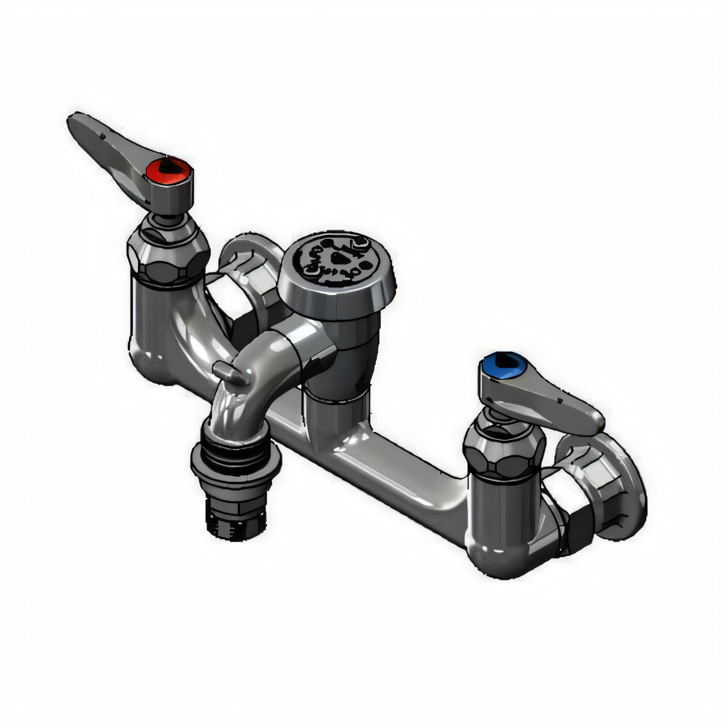 Service Sink Faucet, wall mount, 8" adjustable centers, vacuum breaker spout with pail hook & garden hose outlet with quick disconnect outlet, lever handles with color coded indexes, quarter-turn Eterna cartridges with spring checks, rough chrome plated brass, 1/2" NPT female inlets, low lead, NSF, cCSAus, ADA Compliant