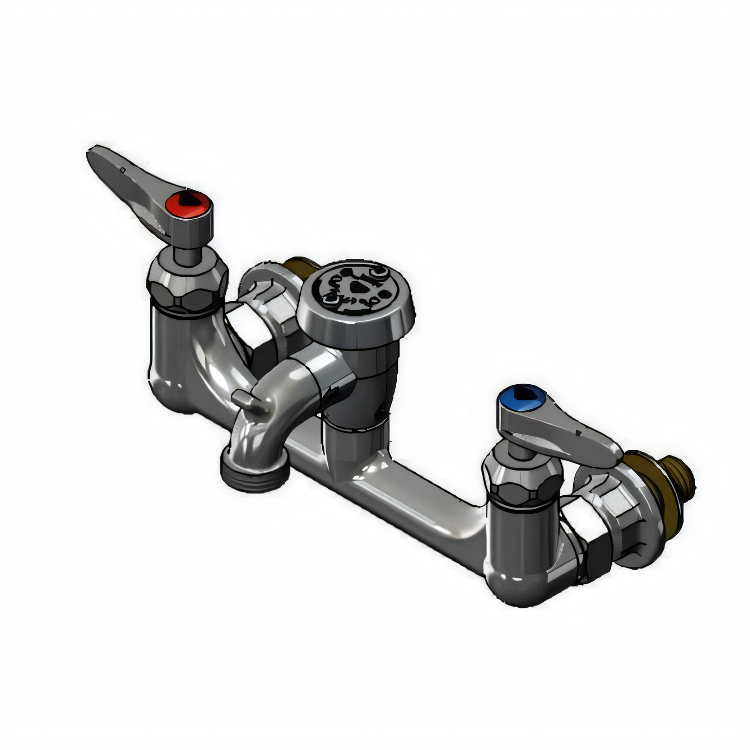 Service Sink Faucet, wall mount, 8" adjustable centers, vacuum breaker spout with pail hook & garden hose outlet with quick disconnect outlet, lever handles with color coded indexes, quarter-turn Cerama cartridges with check valves, rough chrome plated brass, 1/2" NPT female inlets, low lead, NSF, cCSAus, ADA Compliant