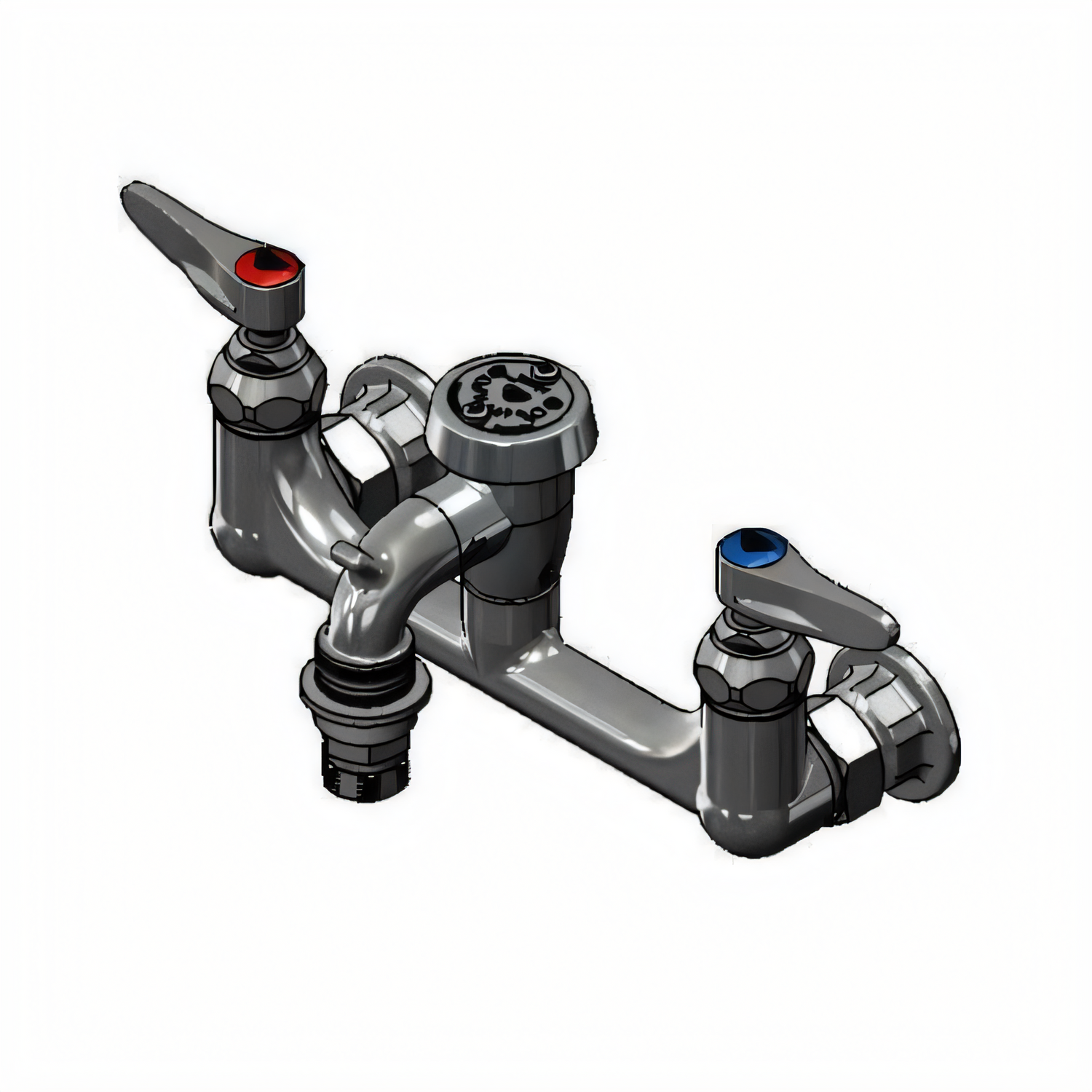 Service Sink Faucet, wall mount, 8" adjustable centers, vacuum breaker spout with pail hook & garden hose outlet with quick disconnect outlet, lever handles with color coded indexes, quarter-turn Eterna cartridges with spring checks, polished chrome plated brass, 1/2" NPT female inlets, low lead, NSF, cCSAus, ADA Compliant