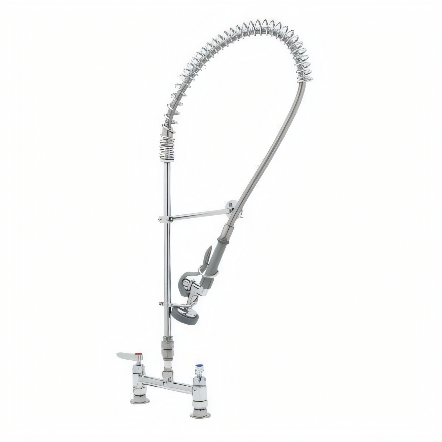 EasyInstall Pre-Rinse Unit, deck mount base, 8" center, spring action gooseneck, 1.15 GPM spray valve (B-0107), 18" riser, 44" flexible stainless steel hose, vacuum breaker, 12" wall bracket, lever handles, quarter-turn Cerama cartridges with check valves, includes supply nipple kit (B-0425-M), low lead, 2019 DOE PRSV - Class II